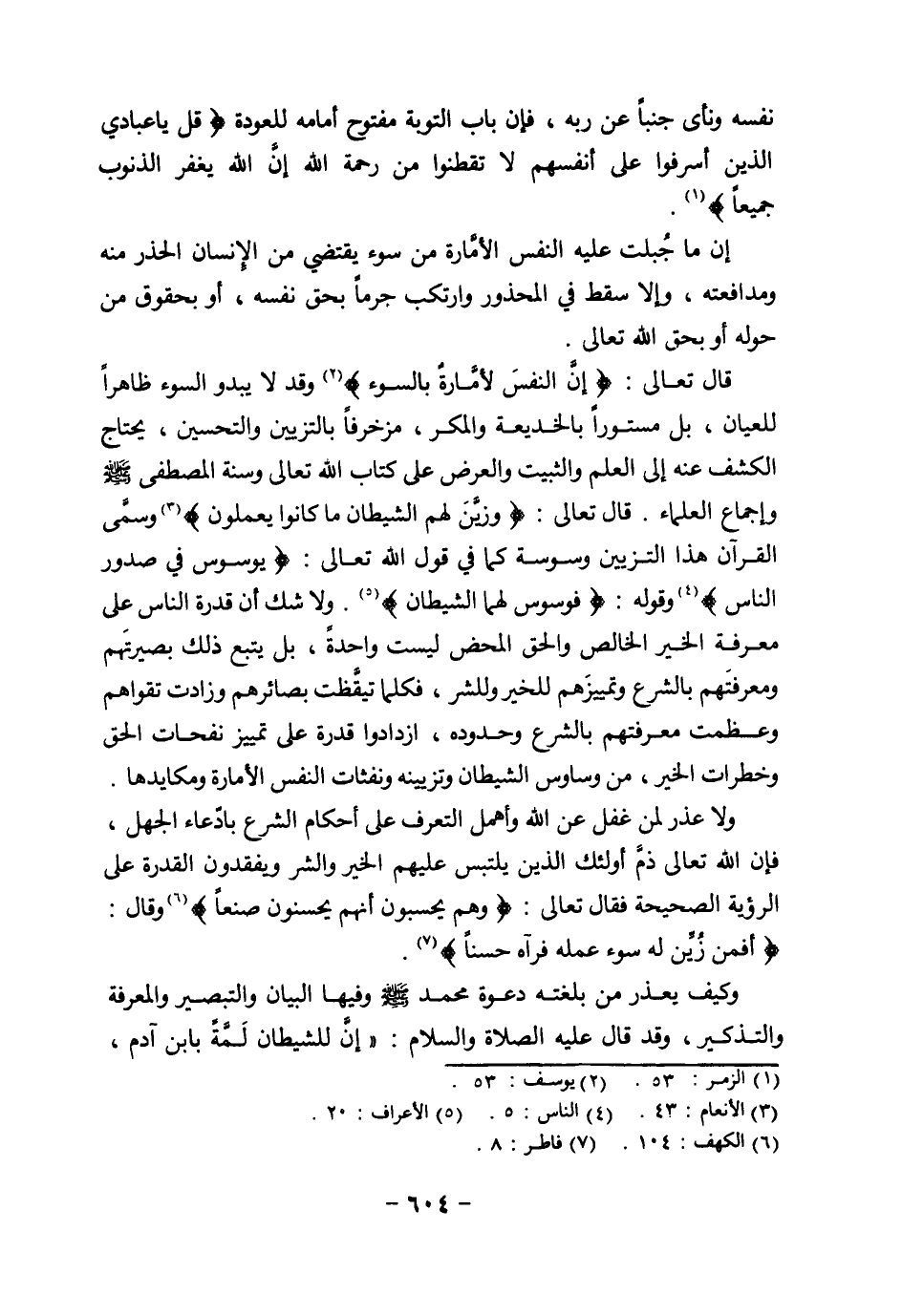قال تعالى: {إِنَّ النَّفْسَ لَأَمَّارَةٌ بِالسُّوءِ} (¬2) وقد لا يبدو السوء ظاهرا للعيان, بل مستورا بالخديعة والمكر, مزخرفا بالتزيين والتحسين, يحتاج الكشف عنه إلى العمل والتثبيت والعرض على كتاب الله تعالى وسنة المصطفى -صلى الله عليه وسلم- وإجماع العلماء. قال تعالى: {وَزَيَّنَ لَهُمُ الشَّيْطَانُ مَا كَانُوا يَعْمَلُونَ} (¬3) وسمى القرآن هذا التزيين وسوسة كما فى قول الله تعالى: {يُوَسْوِسُ فِي صُدُورِ النَّاسِ} (¬4) وقوله: {فَوَسْوَسَ لَهُمَا الشَّيْطَانُ} (¬5).ولا شك أن قدرة الناس على معرفة الخير الخالص والحق المحض ليست واحدة, بل يتبع ذلك بصيرتهم ومعرفتهم بالشرع وتمييزهم للخير وللشر, فكلما تيقظت بصائرهم وزادت تقواهم وعظمت معرفتهم بالشرع وحدوده ,ازدادوا قدرة على تمييز نفحات الخالق وخطرات الخير, من وساوس الشيطان وتزيينه ونفثات النفس الأمارة ومكايدها.