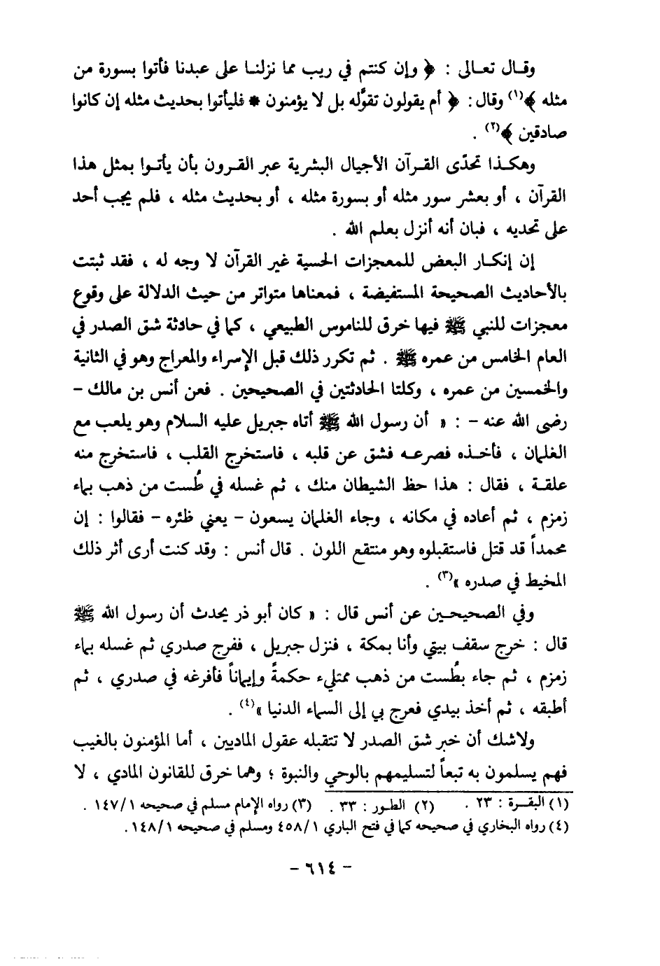 إن إنكار البعض للمعجزات الحسية غير القرآن لا وجه له ,فقد ثبتت بالأحاديث الصحيحة المستفيضة, فمعناها متواتر من حيث الدلالة على وقوع معجزات للنبي -صلى الله عليه وسلم- فيها خرق للناموس الطبيعى, كما فى حادثة شق الصدر فى العام الخامس من عمره - صلى الله عليه وسلم -.ثم تكرر ذلك قبل الإسراء والمعراج وهو فى الثانية والخمسين من عمره, وكلتا الحادثتين فى الصحيحين. فعن أنس بن مالك -رضى الله عنه-: "أن رسول الله -صلى الله عليه وسلم- أتاه جبريل -عليه السلام- وهو يلعب مع الغلمان ,فأخذه فصرعه فشق عن قلبه, فاستخرج القلب, فاستخرج منه علقة, فقال: هذا حظ الشيطان منك, ثم غسله فى طست من ذهب بماء زمزم, ثم أعاده فى مكانه ,وجاء الغلمان يسعون -يعنى ظئره- فقالوا: إن محمدا قد قتل فاستقبوه وهو منتقع اللون. قال أنس: وقد كنت أرى أثر ذلك المخيط فى صدره" (¬3).