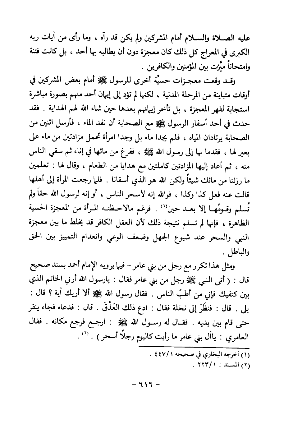 وقد وقعت معجزات حسية أخرى للرسول -صلى الله عليه وسلم- أمام بعض المشركين فى أوقات متابينة من المرحلة المدنية, لكنها لم تؤد إلى إيمان أحد منهم بصورة مباشرة استجابة لقهر المعجزة, بل تأخر إيمانهم بعدها حين شاء الله لهم الهداية, فقد حدث فى أحد أسفار الرسول -صلى الله عليه وسلم- مع الصحابة أن نفد الماء ,فأرسل اثنين من الصحابة يرتادان المياه, فلم يجدا ماء بل وجدا امرأة تحمل مزداتين من ماء على بعير لها, فقدما بها إلى رسول الله -صلى الله عليه وسلم-ففرغ من مائها فى إناء ثم سقى الناس منه, ثم أعاد إليها المزداتين كاملتين مع هدايا من الطعام ,وقال لها: تعلمين ما رزئنا من مائك شيئا ولكن الله هو الذى اسقانا, فلما رجعت المرأة إلى أهلها قالت عنه فعل كذا وكذا, فوالله إنه لأسحر الناس, أو إنه لرسول الله حقا ولم تسلم وقومها إلا بعد حين (¬1). فرغم ما لاحظته المرأة من المعجزة الحسية الظاهرة, فإنها لم تسلم نتيجة ذلك لأن العقل الكافر قد يخلط ما بين معجزة النبي والسحر عند شيوع الجهل وضعف الوعى وانعدام التمييز بين الحق والباطل.