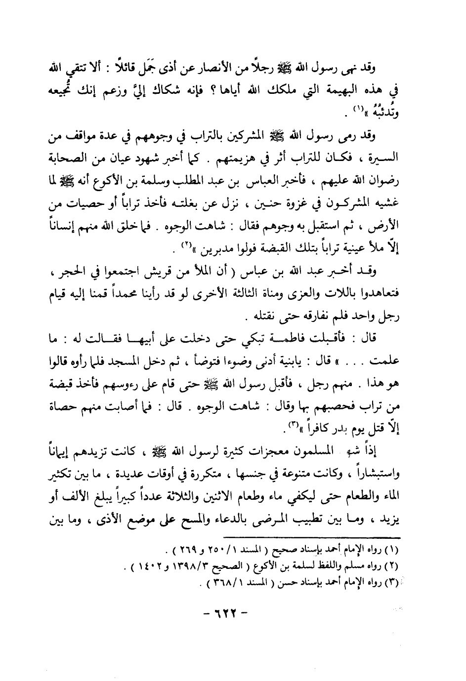 قال: فأقبلت فاطمة تبكي حتى دخلت على أبيها فقالت له: ما علمت .... " قال: يا بنية أدني وضوءا فتوضأ، ثم دخل المسجد فلما رأوه قالوا هو هذا. منهم رجل، فأقبل رسول الله صلى الله عليه وسلم حتى قام على رءوسهم فأخذ قبضة من تراب فحصبهم بها وقال: شاهت الوجوه. قال: فما أصابت منهم حصاة إلا قتل يوم بدر كافرا" (¬3).