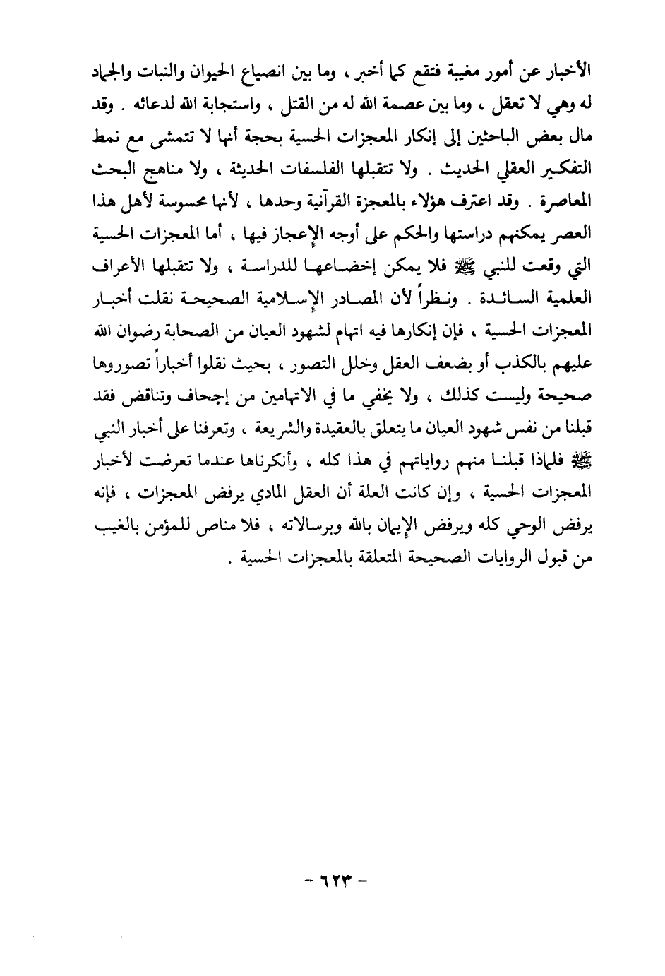 الأخبار عن أمور مغيبة فتقع كما أخبر، وما بين انصياع الحيوان والنبات والجماد له وهي لا تعقل، وما بين عصمة الله له من القتل، واستجابة الله لدعائه. وقد مال بعض الباحثين إلى إنكار المعجزات الحسية بحجة أنها لا تتمشى مع نمط التفكير العقلي الحديث. ولا تتقبلها الفلسفات الحديثة، ولا مناهج البحث المعاصرة. وقد اعترف هؤلاء بالمعجزة القرآنية وحدها، لأنها محسوسة لأهل هذا العصر يمكنهم دراستها والحكم على أوجه الإعجاز فيها، أما المعجزات الحسية التي وقعت للنبي صلى الله عليه وسلم فلا يمكن إخضاعها للدراسة، ولا تتقبلها الأعراف العلمية السائدة. ونظرا لأن المصادر الإسلامية الصحيحة نقلت أخبار المعجزات الحسية، فإن إنكارها فيه اتهام لشهود العيان من الصحابة رضوان الله عليهم بالكذب أو بضعف العقل وخلل التصور، بحث نقلوا أخبارا تصوروها صحيحة وليست كذلك، ولا يخفى ما في الإتهامين من إجحاف وتناقض فقد قبلنا من نفس شهود العيان ما يتعلق بالعقيدة والشريعة، وتعرفنا على أخبار النبي صلى الله عليه وسلم فلماذا قبلنا منهم رواياتهم في هذا كله، وأنكرناها عندما تعرضت لأخبار المعجزات الحسية، وإن كانت العلة أن العقل المادي يرفض المعجزات، فإنه يرفض الوحي كله ويرفض الإيمان بالله وبرسالاته، فلا مناص للمؤمن بالغيب من قبول الروايات الصحيحة المتعلقة بالمعجزات الحسية.