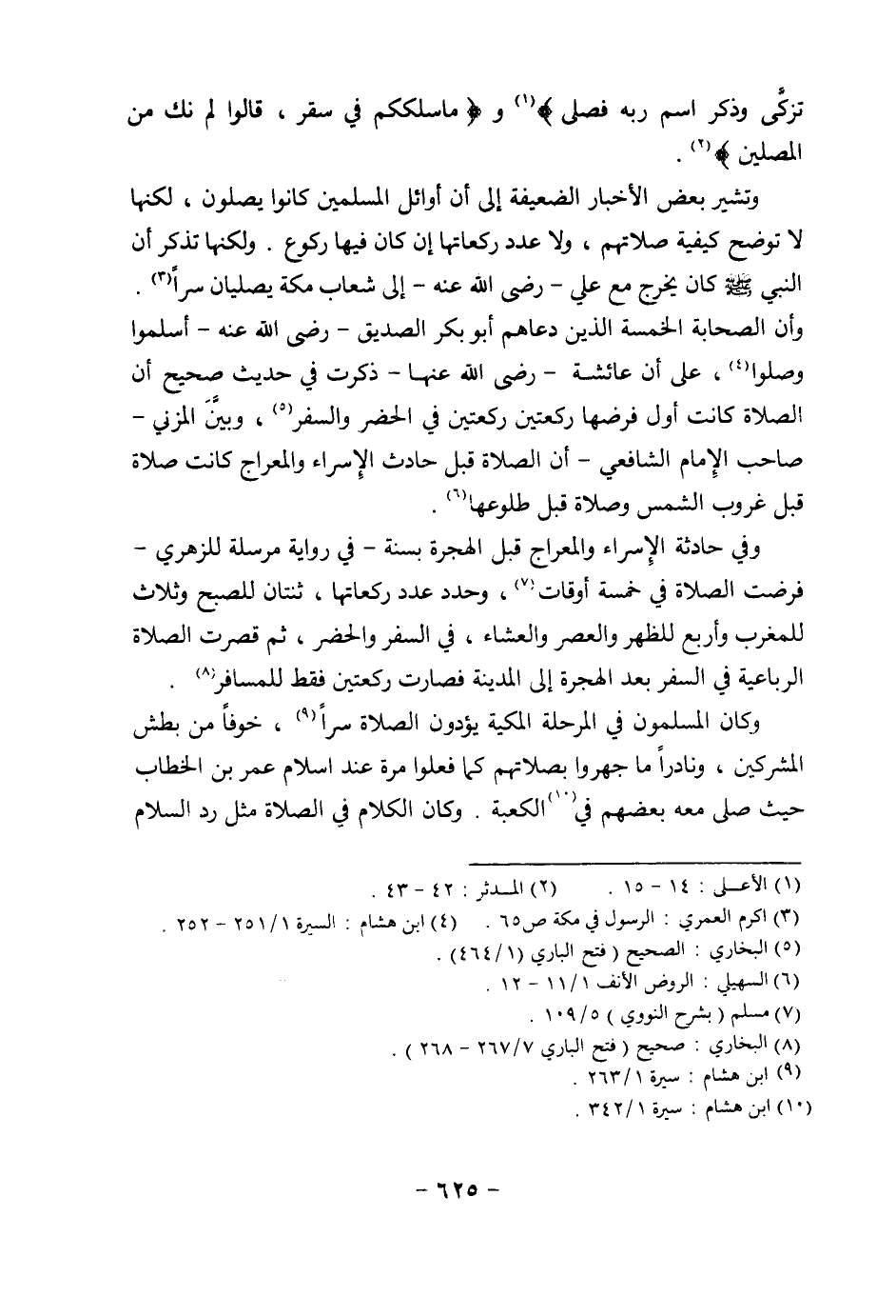 وتشير بعض الأخبار الضعيفة إلى أن أوائل المسلمين كانوا يصلون، لكنها لا توضح كيفية صلاتهم، ولا عدد ركعاتها إن كان فيها ركوع. ولكنها تذكر أن النبي صلى الله عليه وسلم كان يخرج مع علي - رضي الله عنه - إلى شعاب مكة يصليان سراً (¬3). وأن الصحابة الخمسة الذين دعاهم أبو بكر الصديق - رضي الله عنه - أسلموا وصلوا (¬4)، على أن عائشة - رضي الله عنها - ذكرت في حديث صحيح أن الصلاة كانت أول فرضها ركعتين ركعتين في الحضر والسفر (¬5)، وبين المزني - صاحب الإمام الشافعي - أن الصلاة قبل حادث الإسراء والمعراج كانت صلاة قبل غروب الشمس وصلاة قبل طلوعها (¬6).