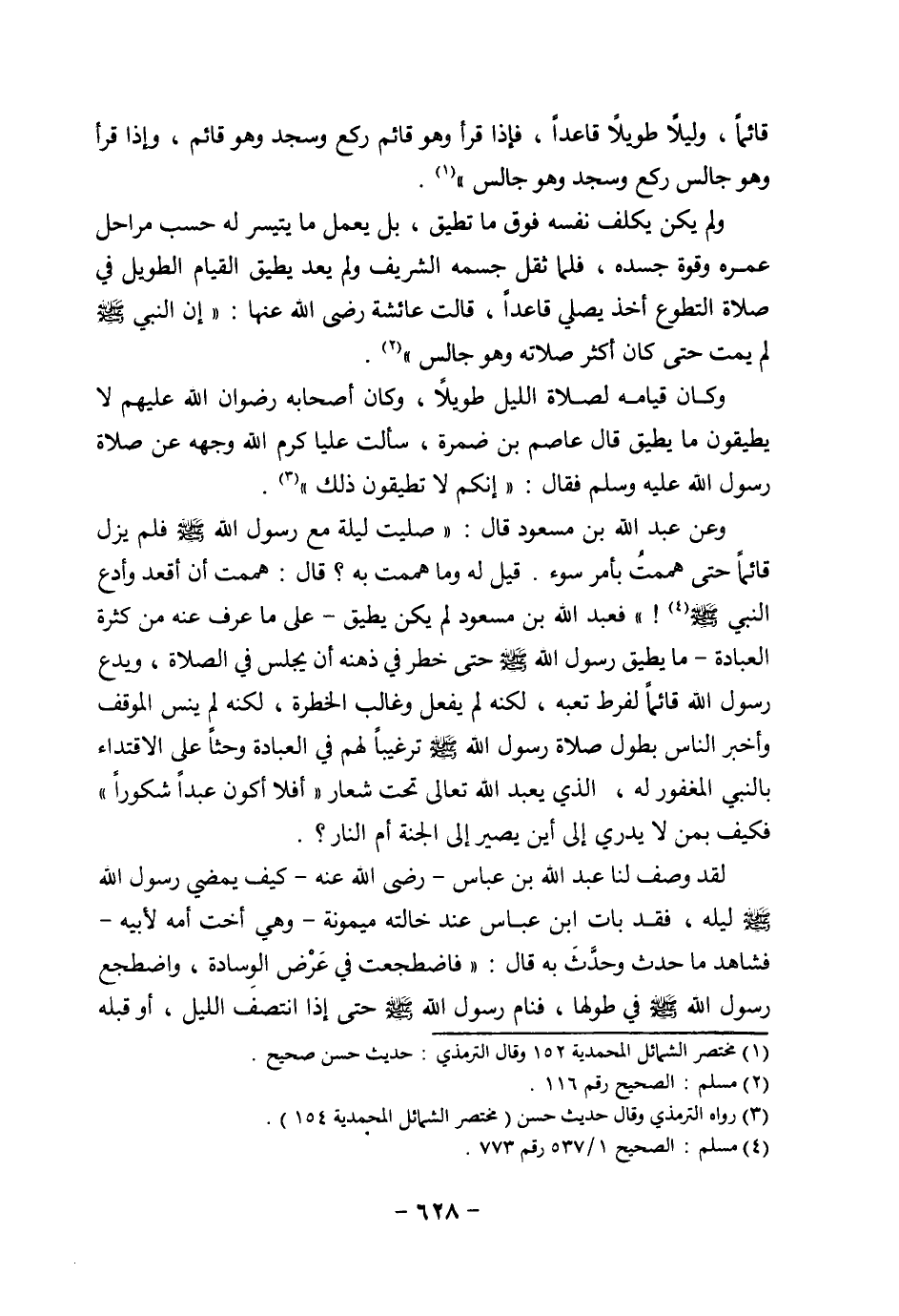 وعن عبد الله بن مسعود قال: "صليت ليلة مع رسول الله صلى الله عليه وسلم فلم يزل قائما حتى هممت بأمر سوء. قيل له وما هممت؟ قال: هممت أن أقعد وأدع النبي صلى الله عليه وسلم (¬4)! " فعبد الله بن مسعود لم يكن يطيق - على ما عرف عنه من كثرة العبادة - ما يطيق رسول الله صلى الله عليه وسلم حتى خطر في ذهنه أن يجلس في الصلاة، ويدع رسول الله قائما لفرط تعبه، لكنه لم يفعل وغالب الخطرة، لكنه لم ينس الموقف وأخبر الناس بطول صلاة رسول الله صلى الله عليه وسلم ترغيبا لهم في العبادة وحثا على الاقتداء بالنبي المغفور له، الذي يعبد الله تعالى تحت شعار "أفلا أكون عبدا شكورا" فكيف بمن لا يدري إلى أين يصير إلى الجنة أم النار؟