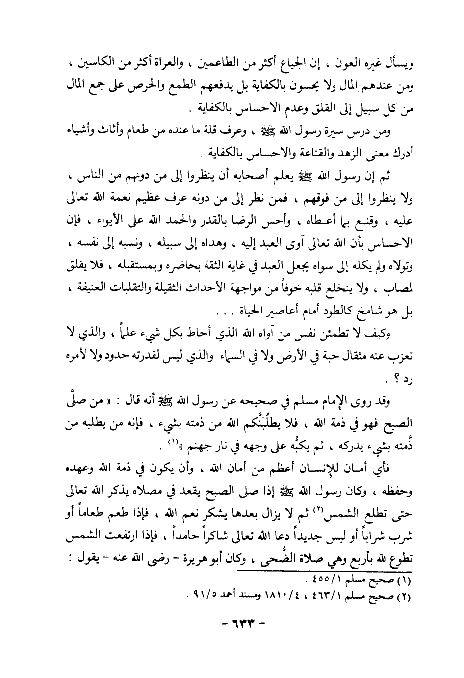 فأي أمان للإنسان أعظم من أمان الله، وأن يكون في ذمة الله وعهده وحفظه، وكان رسول الله صلى الله عليه وسلم إذا صلى الصبح يقعد في مصلاه يذكر الله تعالى حتى تطلع الشمس (¬2) ثم لا يزال بعدها يشكر نعم الله، فإذا طعم طعاما أو شرب شرابا أو لبس جديدا دعا الله تعالى شاكرا حامدا، فإذا ارتفعت الشمس تطوع لله بأربع وهي صلاة الضحى، وكان أبو هريرة - رضي الله عنه - يقول: