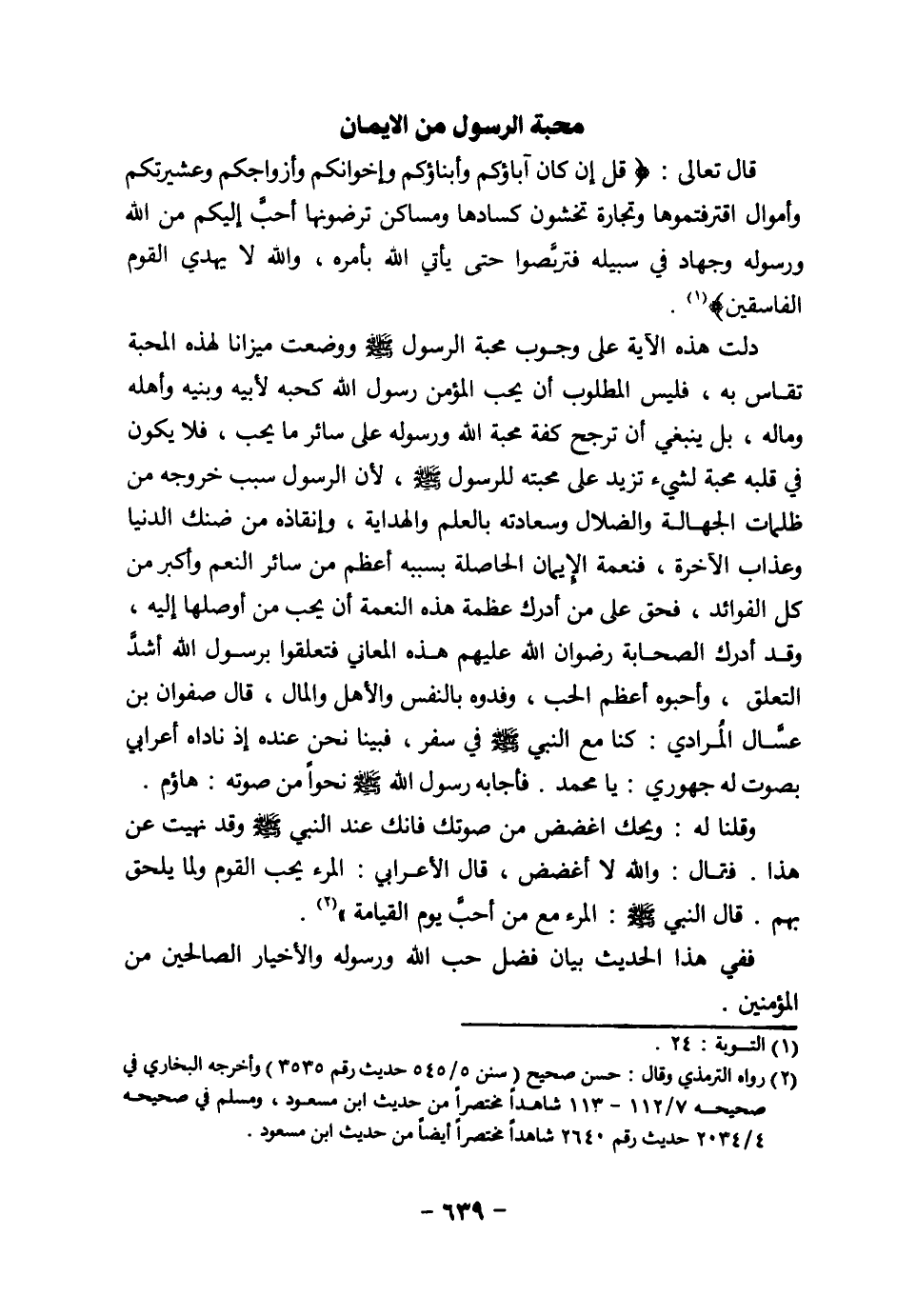 قال تعالى: {قُلْ إِنْ كَانَ آبَاؤُكُمْ وَأَبْنَاؤُكُمْ وَإِخْوَانُكُمْ وَأَزْوَاجُكُمْ وَعَشِيرَتُكُمْ وَأَمْوَالٌ اقْتَرَفْتُمُوهَا وَتِجَارَةٌ تَخْشَوْنَ كَسَادَهَا وَمَسَاكِنُ تَرْضَوْنَهَا أَحَبَّ إِلَيْكُمْ مِنَ اللَّهِ وَرَسُولِهِ وَجِهَادٍ فِي سَبِيلِهِ فَتَرَبَّصُوا حَتَّى يَأْتِيَ اللَّهُ بِأَمْرِهِ وَاللَّهُ لَا يَهْدِي الْقَوْمَ الْفَاسِقِينَ} (¬1).
