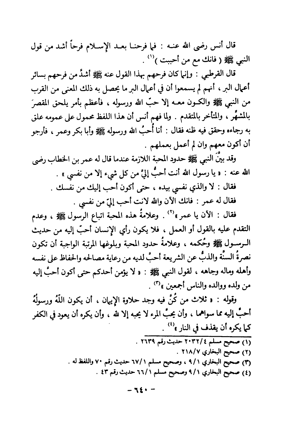 فقال: الآن يا عمر" (¬2). وعلامة هذه المحبة إتباع الرسول صلى الله عليه وسلم، وعدم التقدم عليه بالقول أو العمل، فلا يكون رأى الإنسان أحب إليه من حديث الرسول صلى الله عليه وسلم وحكمه، وعلامة حدود المحبة وبلوغها المرتبة الواجبة أن تكون نصرة السنة والذب عن الشريعة أحب لديه من رعاية مصالحه والحفاظ على نفسه وأهله وماله وجاهه، لقول النبي صلى الله عليه وسلم: "لا يؤمن أحدكم حتى أكون أحبَّ إليه من ولده ووالده والناس أجمعين" (¬3).