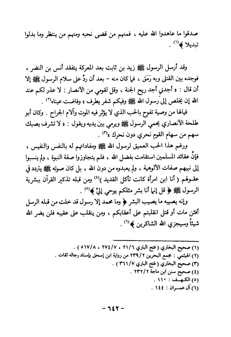 وقد أرسل الرسول صلى الله عليه وسلم زيد بن ثابت بعد المعركة يتفقد أنس بن النضر، فوجده بين القتلى وبه رمق، فما كان منه - بعد أن ردَّ على سلام الرسول صلى الله عليه وسلم إلا أن قال: "أجدني أجد ريح الجنة، وقل لقومي من الأنصار: لا عذر لكم عند الله إن يخلص إلى رسول الله صلى الله عليه وسلم وفيكم شفر يطرف" وفاضت عيناه (¬2).