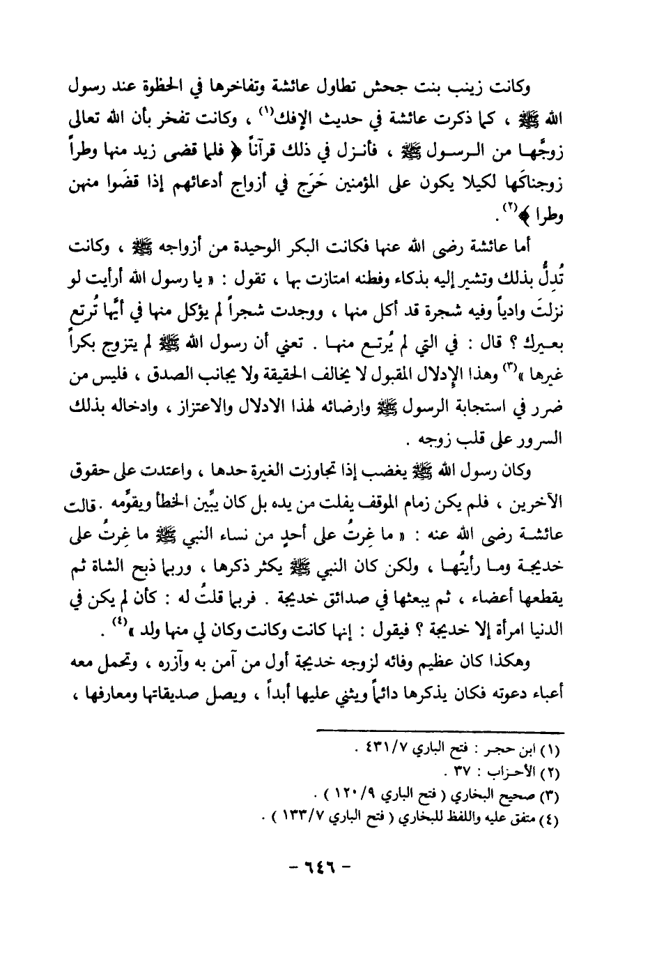 أما عائشة رضي الله عنها فكانت البكر الوحيدة من أزواجه صلى الله عليه وسلم، وكانت تدل بذلك وتشير إليه بذكاء وفطنة امتازت بها، تقول: "يا رسول الله أرأيت لو نزلت واديا وفيه شجرة قد أكل منها، ووجدت شجرة لم يؤكل منها في أيها ترتع بعيرك؟ قال: في التي لم يرتع منها. تعني أن رسول الله صلى الله عليه وسلم لم يتزوج بكرا غيرها" (¬3) وهذا الإدلال المقبول لا يخالف الحقيقة ولا يجانب الصدق، فليس من ضرر في استجابة الرسول صلى الله عليه وسلم وإرضائه لهذا الإدلال والاعتزاز، وإدخاله بذلك السرور على قلب زوجه.