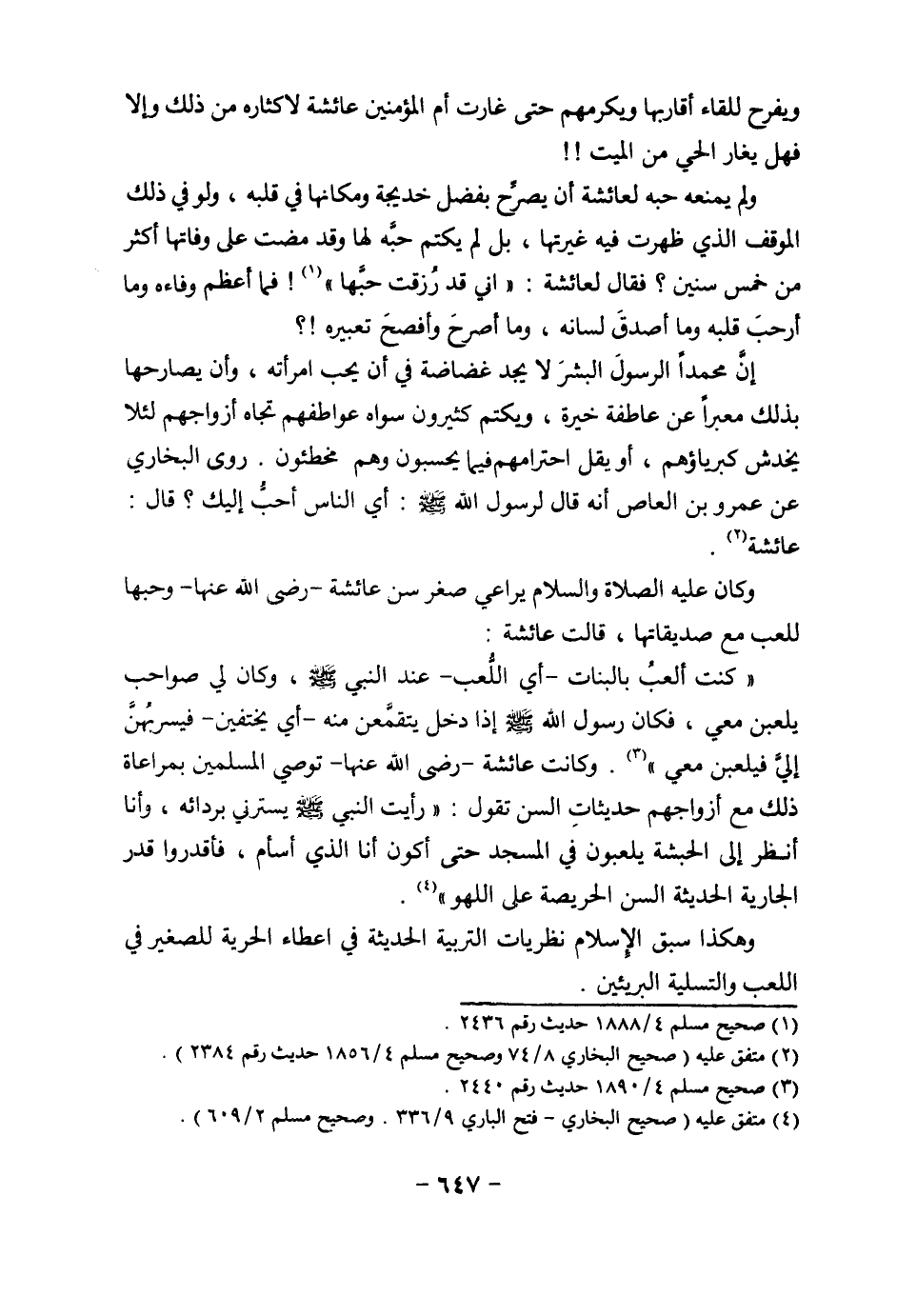 "كنت ألعبُ بالبنات - أي اللُّعب - عند النبي صلى الله عليه وسلم وكان لي صواحب يلعبن معي، فكان رسول الله صلى الله عليه وسلم إذا دخل يتقمَّعن منه - أي يختفين - فيسربهن إلي فيلعبن معي" (¬3).وكانت عائشة - رضي الله عنها - توصي المسلمين بمراعاة ذلك مع أزواجهم حديثات السن تقول: "رأيت النبي صلى الله عليه وسلم يسترني بردائه، وأنا أنظر إلى الحبشة يلعبون في المسجد حتى أكون أنا الذي أسأم، فأقدروا قدر الجارية الحديثة السن الحريصة على اللهو" (¬4).