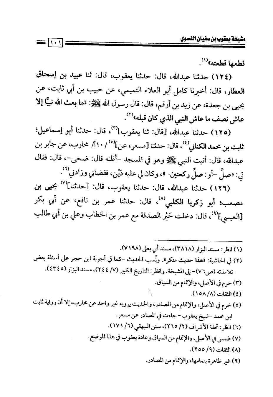 125- حَدَّثَنَا عَبْدُ اللهِ، قَالَ: حَدَّثَنَا يَعْقُوبٌ، قَالَ: حَدَّثَنَا أَبُو إِسْمَاعِيل ثَابِتُ بْنُ مُحَمَّدٍ الْكِنَانِيُّ، قَالَ: حَدَّثَنَا مِسْعَرٌ، عن [10/أ] مُحَارِب، عَنْ جَابِرِ بْنِ عَبْدِ اللهِ، قَالَ: أَتَيْتُ النَّبِيَّ صَلَّى اللَّهُ عَلَيْهِ وَسَلَّمَ وَهُوَ فِي المَسْجِدِ، أظنه قَالَ: ضُحًى، قال: فَقَالَ لي: صَلِّ، أو صَلِّ رَكْعَتَيْنِ وَكَانَ لِي عَلَيْهِ دَيْنٌ فَقَضَانِي وَزَادَنِي.