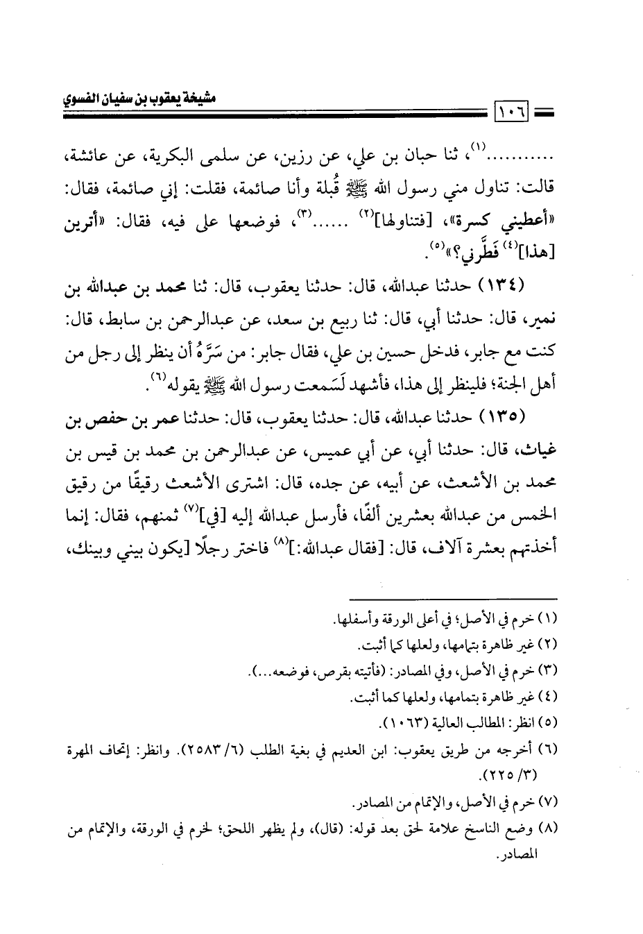 131- حَدَّثَنَا عَبْدُ اللهِ، قَالَ: حَدَّثَنَا يَعْقُوبٌ...... (1) قَالَ: أخبرنا مَالِكُ بْنُ مِغْوَلٍ، عَنْ طَلْحَةَ [11/ب] عن عَبْدِ اللهِ بْنِ أَبِي أَوْفَى: قال: سألته، هل أَوْصَى رسول الله صَلَّى اللَّهُ عَلَيْهِ وَسَلَّمَ؟ قَالَ: لاَ، فقُلْتُ: فَكَيْفَ كتب على الْمُسْلِمِينَ الْوَصِيَّة، ولم يوص؟ أو..... (2) ولم يوص؟ قَالَ: أَوْصَى بِكِتَابِ اللهِ.