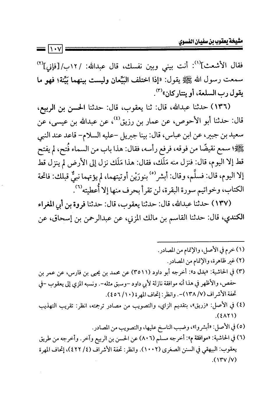 136- حَدَّثَنَا عَبْدُ اللهِ، قَالَ: حَدَّثَنَا يَعْقُوبٌ، قَالَ: حَدَّثَنَا الحسن بن الربيع، قَالَ: حَدَّثَنَا أبو الأحوص، عن عمار بن رزيق، عن عبد الله بن عيسى، عن سعيد بن جبير، عن ابن عباس، قال: بينا جبريل، عليه السلام، قاعد عند النبي صلى الله عَلَيْهِ وَسَلَّمَ سمع نقيضًا من فوقه، فرفع رأسه، فقال: هذا باب من السماء فُتح، لم يفتح قط إلا اليوم، قال: فنزل منه ملك، فقال: هذا ملك نزل إلى الأرض لم ينزل قط إلا اليوم، قال: فسلم، وقال: أبشر بنورين أوتيتهما لم يؤتهما نبي قبلك: فاتحة الكتاب وخواتيم سورة البقرة لن تقرأ بحرف منها إلا أُعطيته.