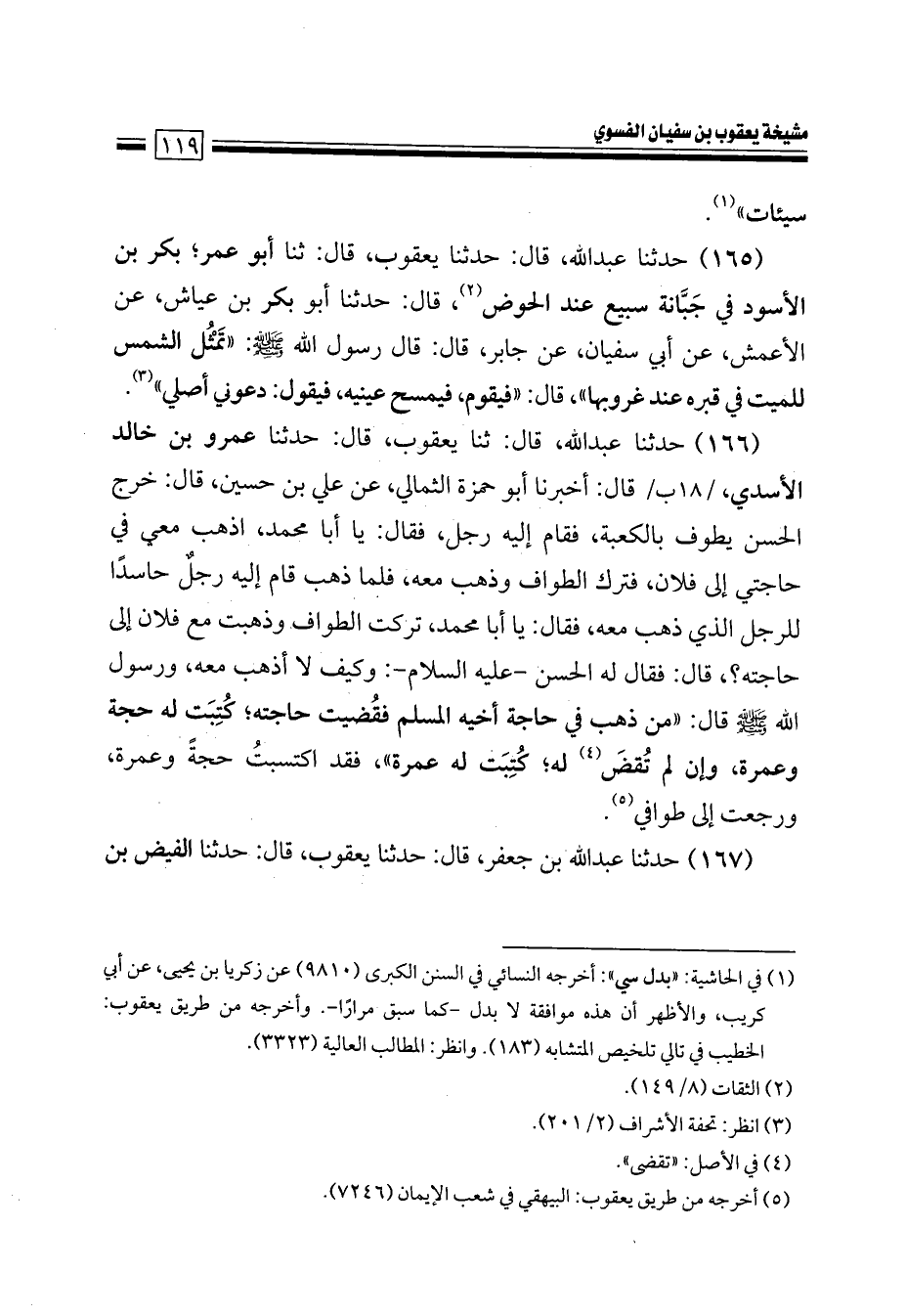 166- حَدَّثَنَا عَبْدُ اللهِ، قَالَ: حَدَّثَنَا يَعْقُوبٌ، قَالَ: حَدَّثَنَا عَمْرُو بْنُ خَالِدٍ الأَسَدِيُّ [18/ب] قَالَ: أَخْبَرَنَا أَبُو حَمْزَةَ الثُّمَالِيُّ، عَنْ عَلِيِّ بْنِ حُسَيْنٍ، قَالَ: خَرَجَ الْحَسَنُ يَطُوفُ بِالْكَعْبَةِ، فَقَامَ إِلَيْهِ رَجُلٌ فَقَالَ: يَا أَبَا مُحَمَّدٍ، اذْهَبْ مَعِي فِي حَاجتي إِلَى فُلاَنٍ، فَتَرَكَ الطَّوَافَ وَذَهَبَ مَعَهُ، فَلَمَّا ذَهَبَ قَامَ إِلَيْهِ رَجُلٌ حَاسِدًا لِلرَّجُلِ الَّذِي ذَهَبَ مَعَهُ، فَقَالَ: يَا أَبَا مُحَمَّدٍ، تَرَكْتَ الطَّوَافَ وَذَهَبَتَ مع فلان إلى حَاجَتِهِ؟ قَالَ: فَقَالَ لَهُ الْحَسَنُ، عَلَيْهِ السَّلاَمُ: وَكَيْفَ لاَ أَذْهَبُ مَعَهُ؟ وَرَسُولُ اللهِ صَلَّى الله عَلَيْهِ وَسَلَّمَ قَالَ: مَنْ ذَهَبَ فِي حَاجَةٍ أَخِيهِ الْمُسْلِمِ فَقُضِيَتْ حَاجَتُهُ كُتِبَتْ له حَجَّةً وَعُمْرَةً، وَإِنْ لَمْ تُقْضَ له كُتِبَتْ لَهُ عُمْرَةٌ فَقَدِ اكْتَسَبْتُ حِجَّةً وَعُمْرَةً وَرَجَعْتُ إِلَى طَوَافِي.