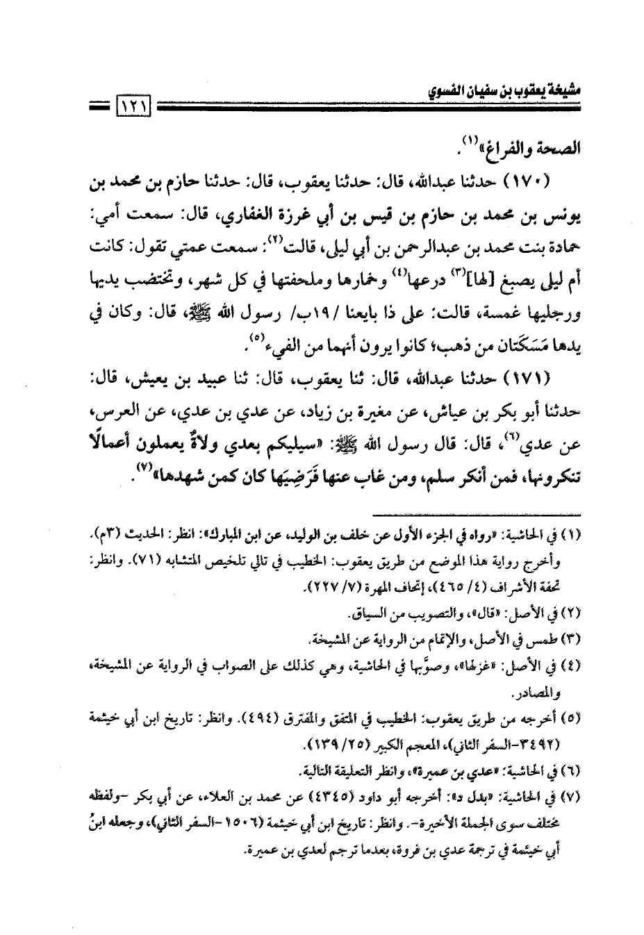171- حَدَّثَنَا عَبْدُ اللهِ، قَالَ: حَدَّثَنَا يَعْقُوبٌ، قَالَ: حَدَّثَنَا عُبَيْدُ بْنُ يَعِيشَ، قَالَ: حَدَّثَنَا أَبُو بَكْرِ بْنُ عَيَّاشٍ، عن مُغِيرَةَ بْنِ زِيَادٍ، عَنْ عَدِيِّ بْنِ عَدِيٍّ، عَنِ الْعُرْسِ، عن عدي، قَالَ: قَالَ رَسُول الله صَلَّىَ اللهُ عَلَيْهِ وَسَلَّمَ: سيليكم بعدي ولاة يعملون أعمالا تنكرونها، فمن أنكر سلم، وَمَنْ غَابَ عَنْهَا فَرَضِيَهَا، كَانَ كَمَنْ شَهِدَهَا.