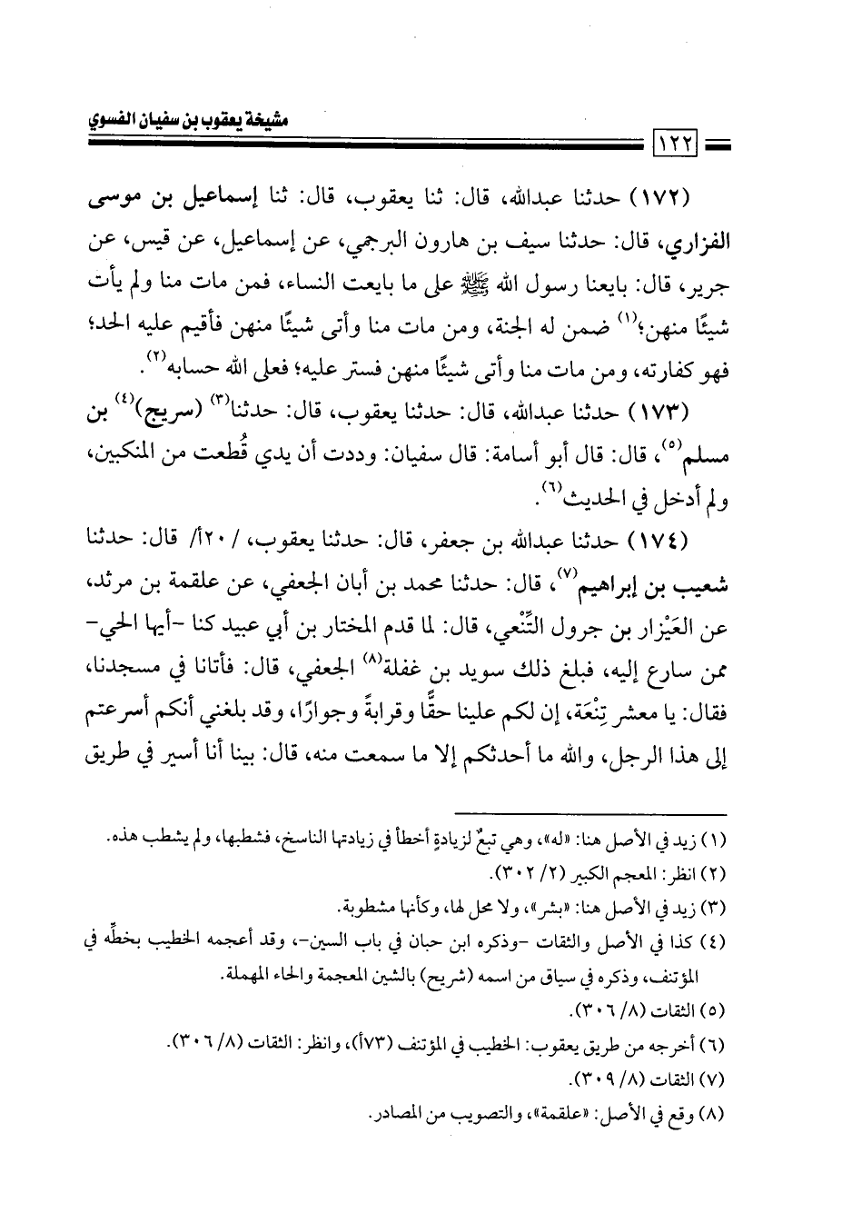 172- حَدَّثَنَا عَبْدُ اللهِ، قَالَ: حَدَّثَنَا يَعْقُوبٌ، قَالَ: حَدَّثَنَا إِسْمَاعِيلُ بْنُ مُوسَى الْفَزَارِيُّ، قَالَ حَدَّثَنَا سَيْفُ بْنُ هَارُونَ البُرْجُمِيُّ، عَنْ إسْمَاعِيلَ، عَنْ قَيْسٍ، عَنْ جَرِير، قَالَ: بَايَعْنَا رَسُولَ اللهِ صَلَّىَ اللهُ عَلَيْهِ وَسَلَّمَ عَلَى مَا بَايَعَتْ النِّسَاءُ، فَمَنْ مَاتَ مِنَّا وَلَمْ يَأْتِ شَيْئًا مِنْهُنَّ: ضَمِنَ لَهُ الْجَنَّةَ، وَمَنْ مَاتَ مِنَّا وَأَتَى شيئًا منهن فَأُقِيمَ عَلَيْهِ الْحَدُّ فَهُوَ كَفَّارَتُهُ وَمَنْ مَاتَ مِنَّا وَأَتَى شَيْئًا مِنْهُنَّ فَسُتِرَ عَلَيْهِ فَعَلَى اللهِ حِسَابُهُ.