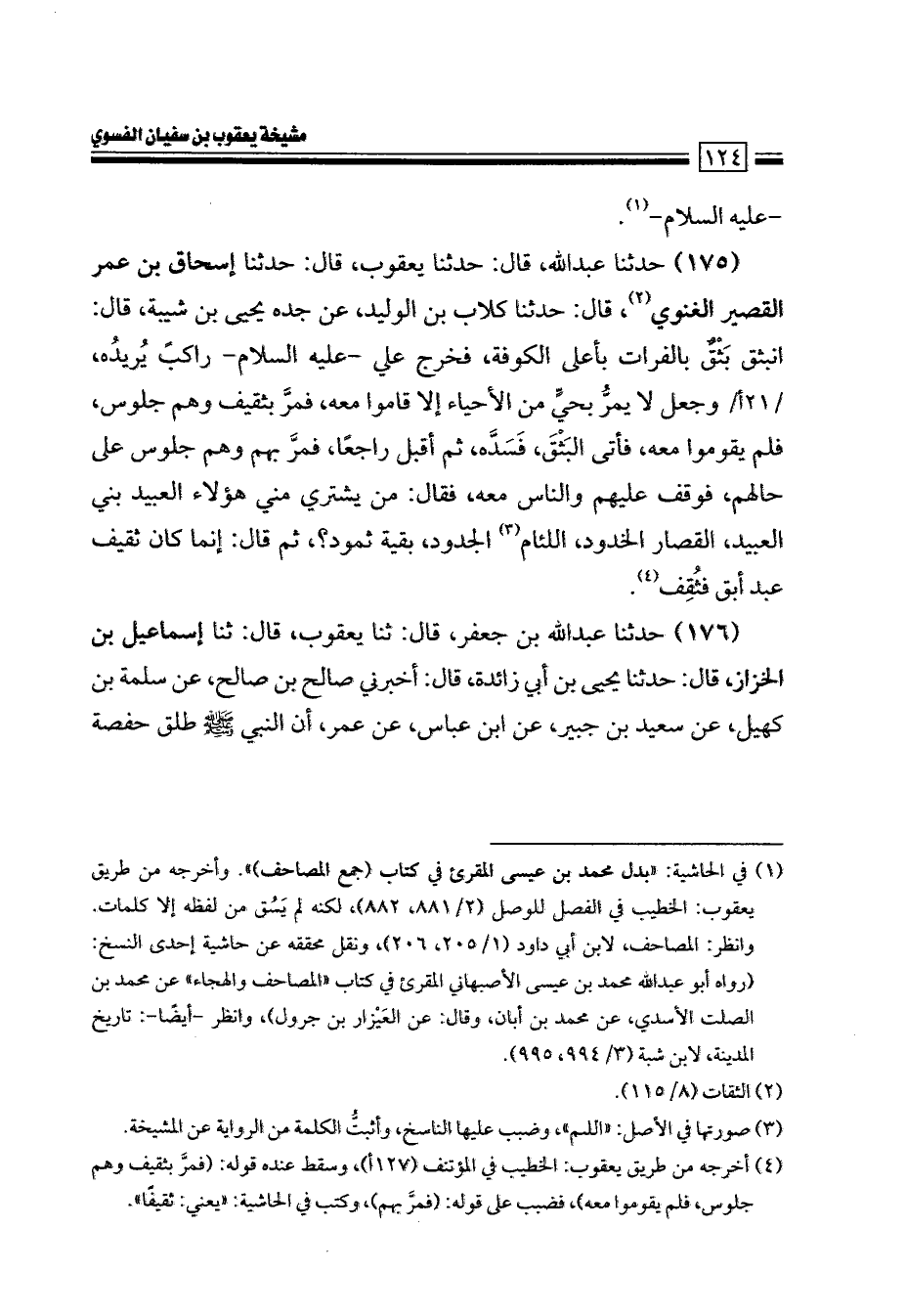 175 - حَدَّثَنَا عَبْدُ اللهِ، قَالَ: حَدَّثَنَا يَعْقُوبٌ، قَالَ حَدَّثَنَا إِسْحَاقُ بْنُ عُمر الْقَصِيرُ الْغَنَوِيُّ، قَالَ: حَدَّثَنَا كلاب بن الوليد، عن جده يحيى بن شيبة، قَالَ: انبثق بثق بالفرات بأعلى الكوفة، فخرج علي، عليه السلام، راكبً يريده [21/أ] وجعل، لا يمر بحي من الأحياء إلا قاموا معه، فمر بثقيف وهم جلوس، فلم يقوموا معه، فأتى البثق، فَسَدَّهُ، ثم أقبل راجعًا، فمر بهم وهم جلوس على حالهم، فوقف عليهم، والناس معه، فقال من يشتري مني هؤلاء العبيد بني العبيد القصار الخدود، اللئام الجدود، بقية ثمود، ثم قال: إنما كان ثقيف عبد أبق، فثقف.