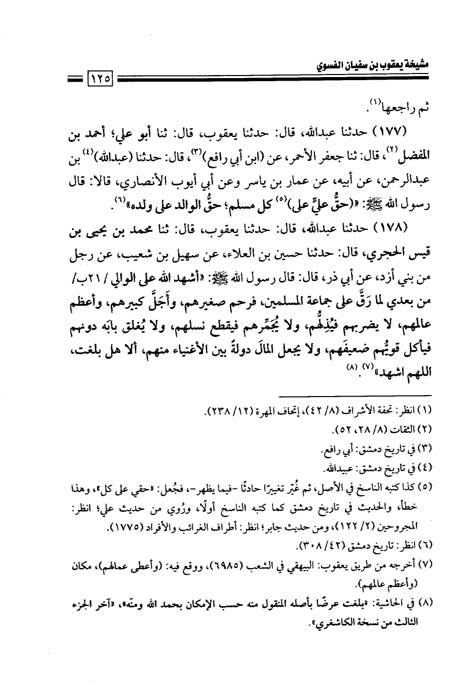 177 - حَدَّثَنَا عَبْدُ اللهِ، قَالَ: حَدَّثَنَا يَعْقُوبٌ، قَالَ: حَدَّثَنَا أَبُو عَلِيٍّ أَحْمَدُ بْنُ الْمُفَضَّلِ، قَالَ: حَدَّثَنَا جَعْفَرٌ الأحمر، عَنِ ابْنِ أَبِي رَافِعٍ، قَالَ: حَدَّثَنَا عَبْدُ اللهِ بْنُ عَبْدِ الرَّحْمَنِ، عَنْ أَبِيهِ، عَنْ عَمَّارِ بْنِ يَاسِرٍ، وعَنْ أَبِي أَيُّوبَ الأََنْصَارِيِّ، قَالا: قَالَ رَسُولُ اللهِ صَلَّى اللَّهُ عَلَيْهِ وَسَلَّمَ: حَقُّ عليٍّ عَلَى كُلِّ مُسْلِمٍ، حَقُّ الْوَالِدِ عَلَى وَلَدِهِ.