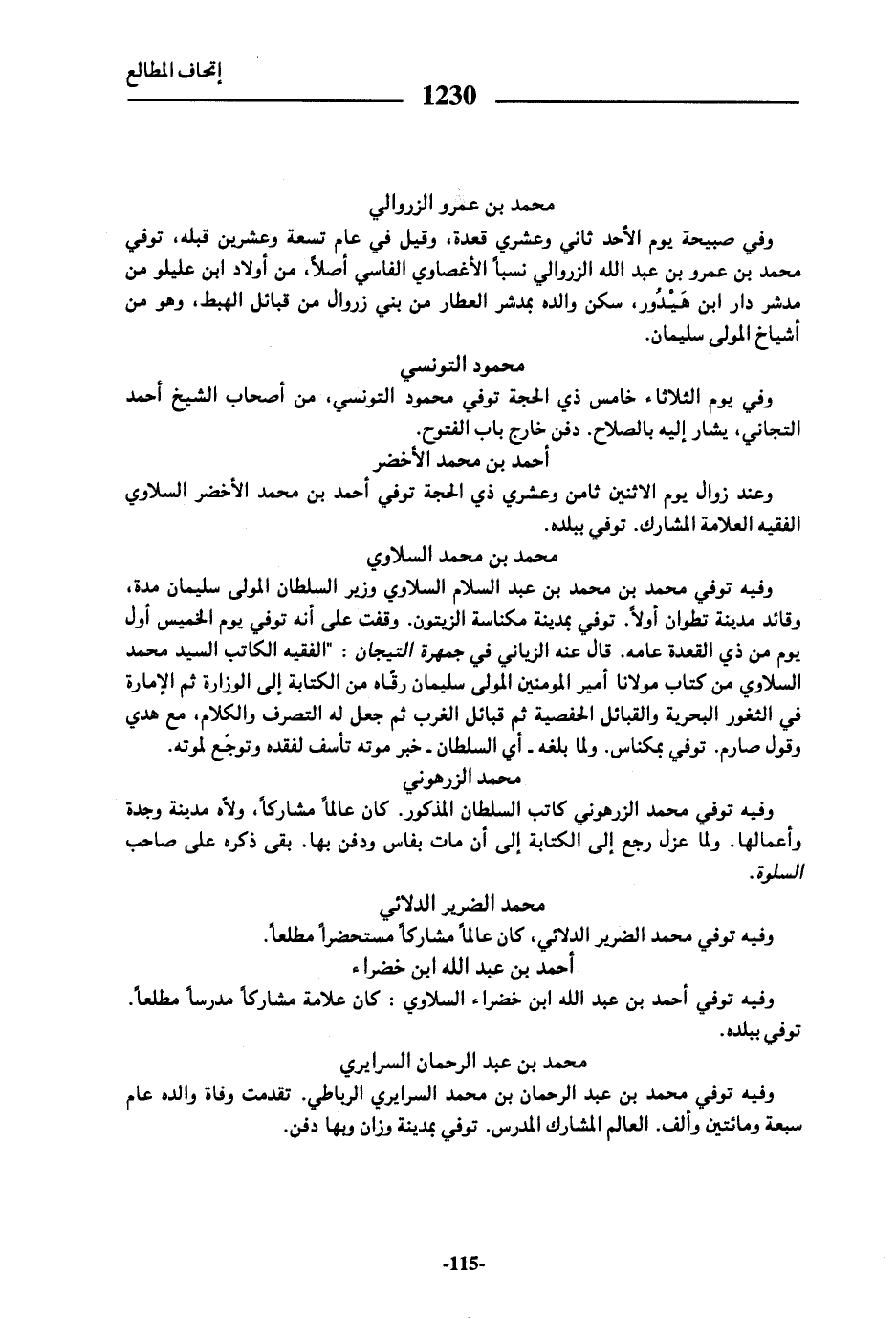 وفي صبيحة يوم الأحد ثاني وعشري قعدة، وقيل في عام تسعة وعشرين قبله، توفي محمد بن عمرو بن عبد الله الزروالي نسبا الأغصاوي الفاسي أصلا، من أولاد ابن عليلو من مدشر دار ابن هيدور، سكن والده بمدشر العطار من بني زروال من قبائل الهبط، وهو من أشياخ المولى سليمان.