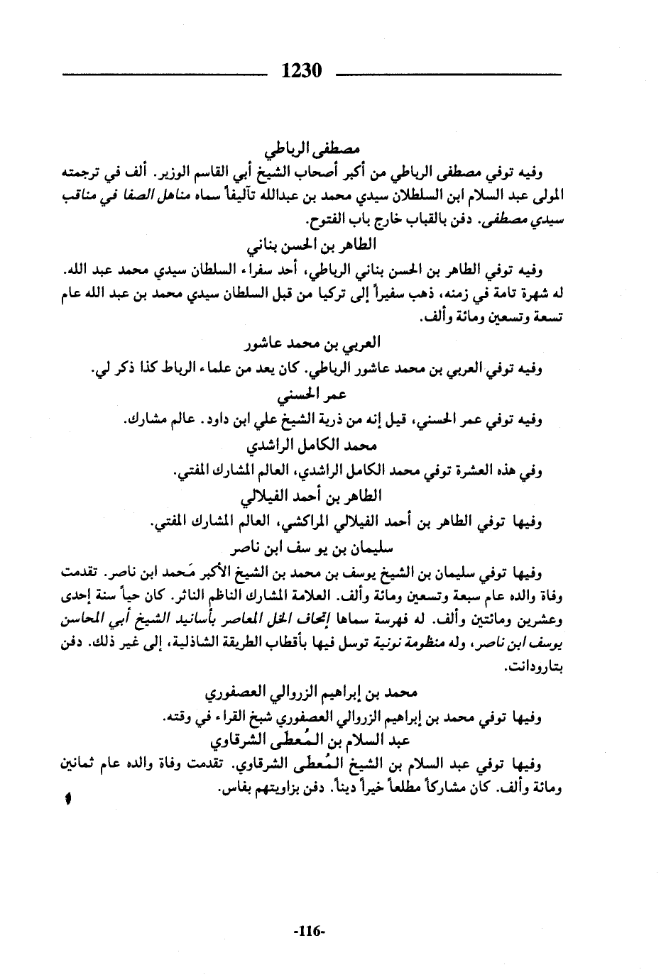 وفيها توفي سليمان بن الشيخ يوسف بن محمد بن الشيخ الأكبر محمد ابن ناصر. تقدمت وفاة والده عام سبعة وتسعين ومائة وألف. العلامة المشارك الناظم الناثر. كان حيا سنة إحدى وعشرين ومائتين وألف. له فهرسة سماها إتحاف الخل المعاصر بأسانيد الشيخ أبي المحاسن يوسف ابن ناصر، وله منظومة نونية توسل فيها بأقطاب الطريقة الشاذلية، إلى غير ذلك. دفن بتارودانت.