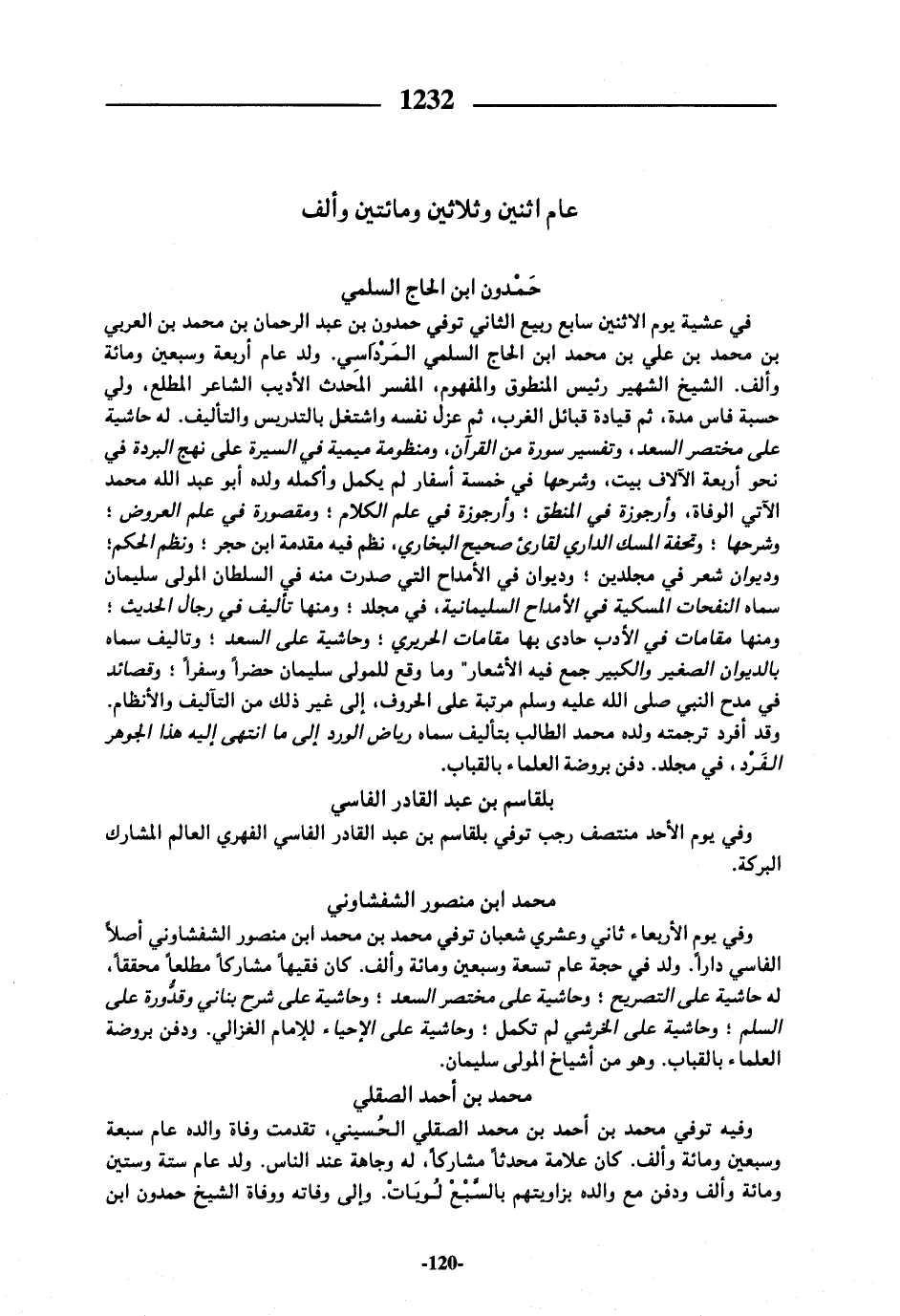 في عشية يوم الاثنين سابع ربيع الثاني توفي حمدون بن عبد الرحمان بن محمد بن العربي بن محمد بن علي بن محمد ابن الحاج السلمي المرداسي. ولد عام أربعة وسبعين ومائة وألف. الشيخ الشهير رئيس المنطوق والمفهوم، المفسر المحدث الأديب الشاعر المطلع، ولي حسبة فاس مدة، ثم قيادة قبائل الغرب، ثم عزل نفسه واشتغل بالتدريس والتأليف. له حاشية على مختصر السعد، وتفسير سورة من القرآن، ومنظومة ميمية في السيرة على نهج البردة في نحو أربعة الآلاف بيت، وشرحها في خمسة أسفار لم يكمل وأكمله ولده أبو عبد الله محمد الآتي الوفاة، وأرجوزة في المنطق؛ وأرجوزة في علم الكلام؛ ومقصورة في علم العروض؛ وشرحها؛ وتحفة المسك الداري لقارئ صحيح البخاري، نظم فيه مقدمة ابن حجر؛ ونظم الحكم؛ وديوان شعر في مجلدين؛ وديوان في الأمداح التي صدرت منه في السلطان المولى سليمان سماه النفحات المسكية في الأمداح السليمانية، في مجلد؛ ومنها تأليف في رجال الحديث؛ ومنها مقامات في الأدب حادى بها مقامات الحريري؛ وحاشية على السعد؛ وتاليف سماه بالديوان الصغير والكبير جمع فيه الأشعار"وما وقع للمولى سليمان حضرا وسفرا؛ وقصائد في مدح النبي صلى الله عليه وسلم مرتبة على الحروف، إلى غير ذلك من التآليف والأنظام.