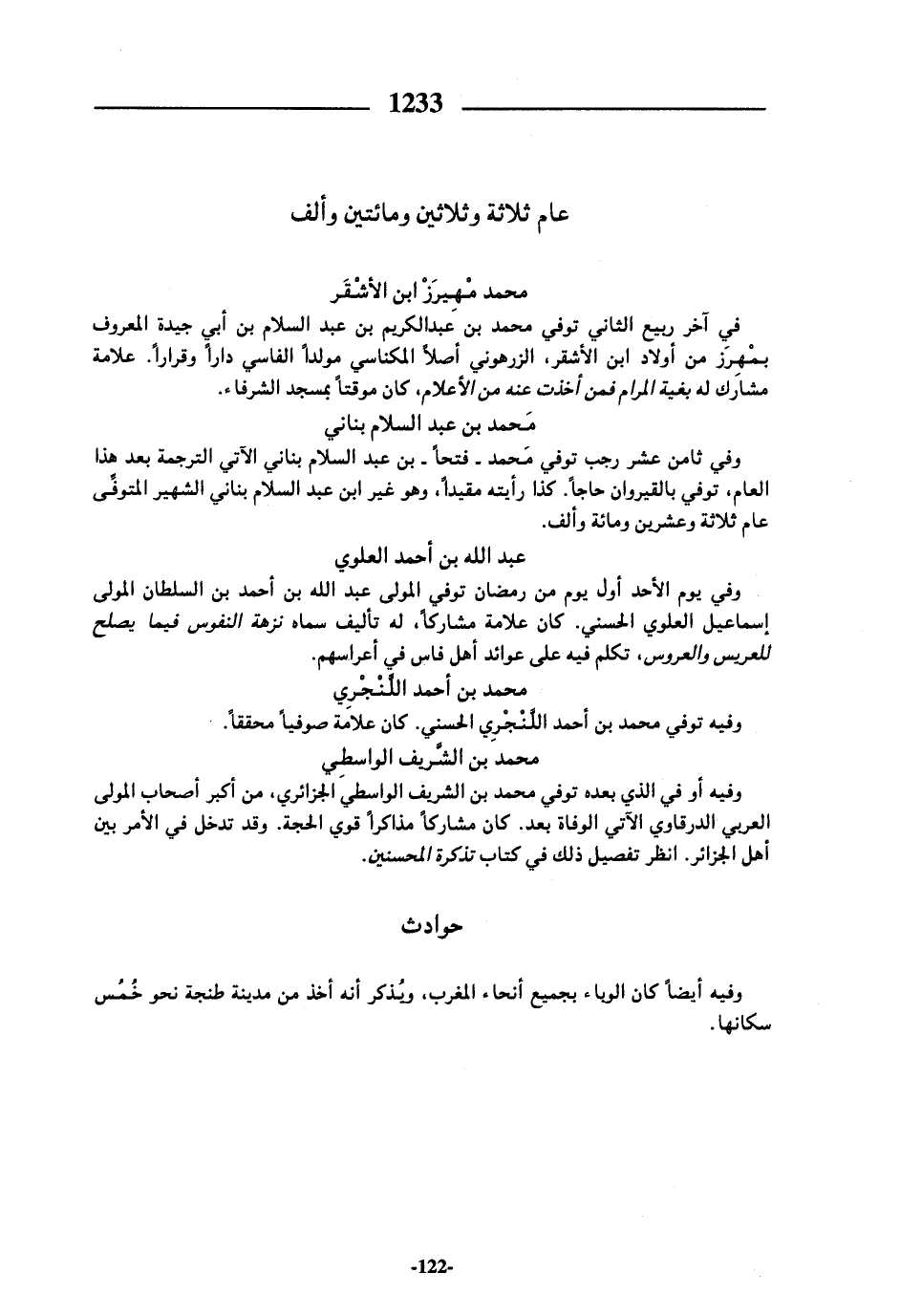 وفي ثامن عشر رجب توفي محمد-فتحا-بن عبد السلام بناني الآتي الترجمة بعد هذا العام، توفي بالقيروان حاجا. كذا رأيته مقيدا، وهو غير ابن عبد السلام بناني الشهير المتوفّى عام ثلاثة وعشرين ومائة وألف.