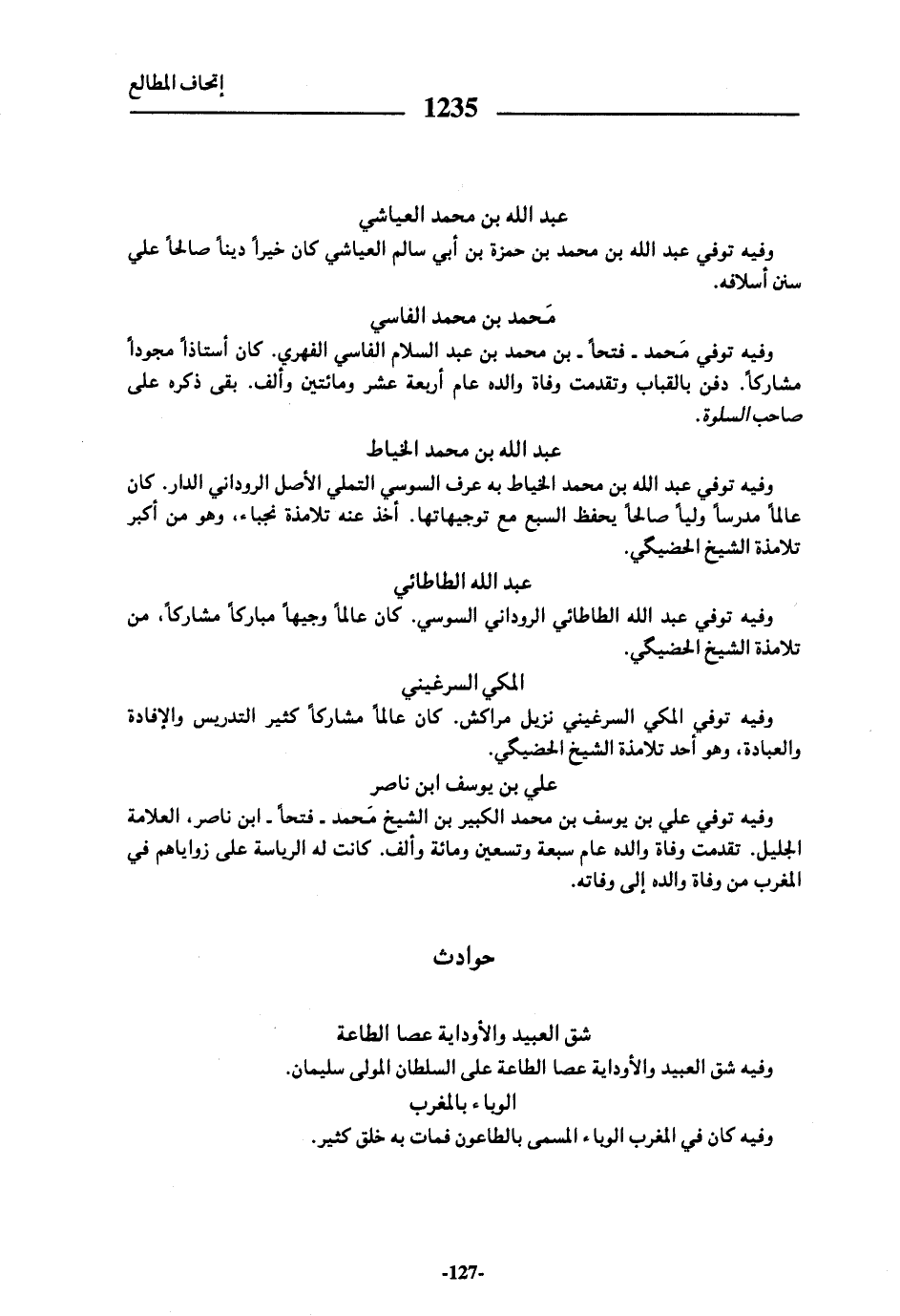 وفيه توفي عبد الله بن محمد بن حمزة بن أبي سالم العياشي كان خيرا دينا صالحا علي سنن أسلافه.