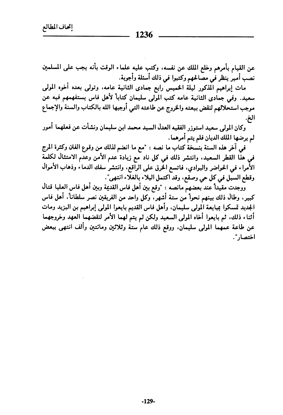 ووجدت مقيدا عند بعضهم ما نصه: "وقع بين أهل فاس القديمة وبين أهل فاس العليا قتال كبير، وطال ذلك بينهم نحوا من ستة أشهر، وكل واحد من الفريقين نصر سلطانا، أهل فاس الجديد تمسكوا بمبايعة المولى سليمان، وأهل فاس القديم بايعوا المولى إبراهيم بن اليزيد ومات أثناء ذلك، ثم بايعوا أخاه المولى السعيد ولكن لم يتم لهما الأمر لنقضهما العهد وخروجهما عن طاعة عمهما المولى سليمان، ووقع ذلك عام ستة وثلاثين ومائتين وألف انتهى ببعض اختصار".