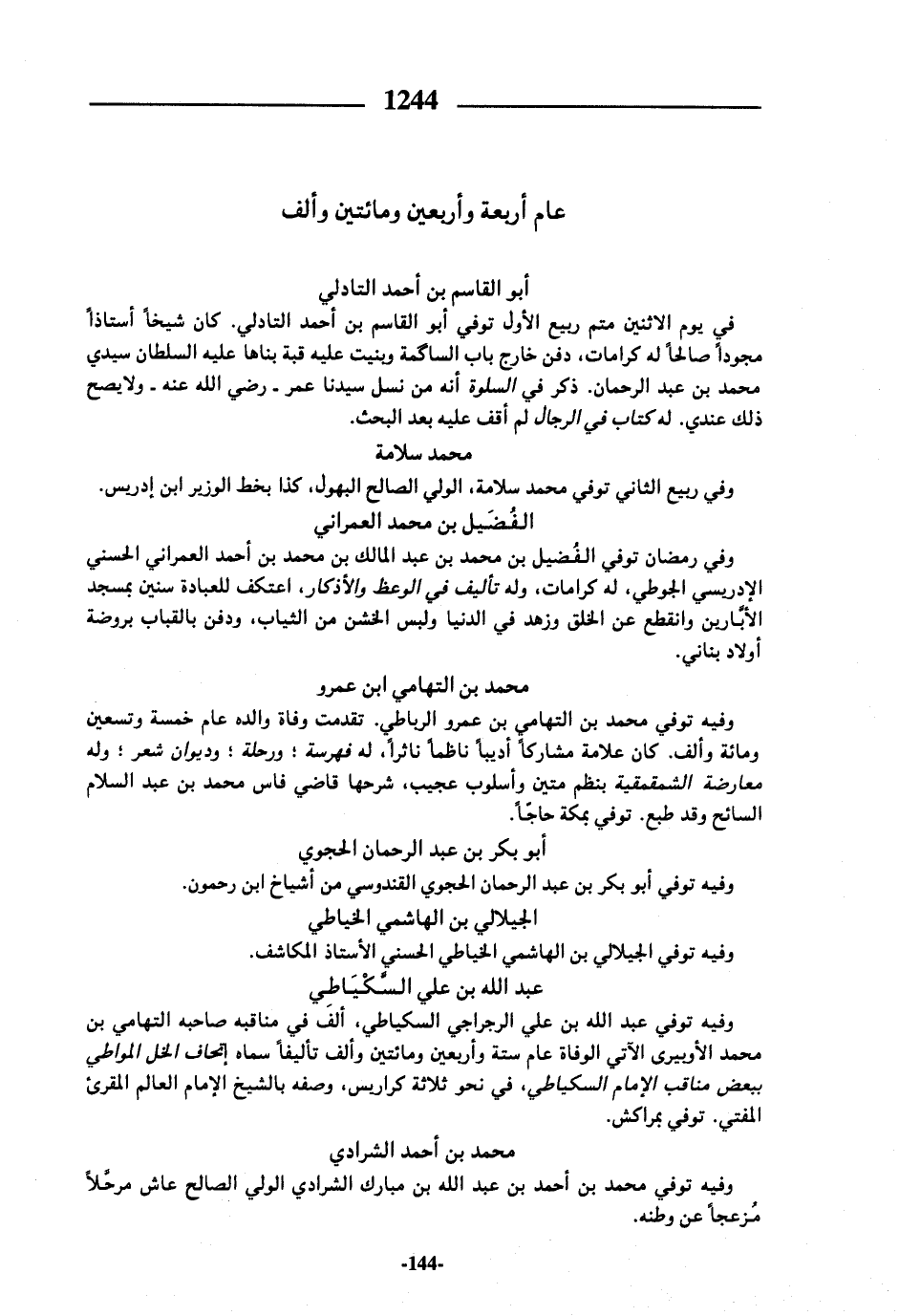 في يوم الاثنين متم ربيع الأول توفي أبو القاسم بن أحمد التادلي. كان شيخا أستاذا مجودا صالحا له كرامات، دفن خارج باب الساكمة وبنيت عليه قبة بناها عليه السلطان سيدي محمد بن عبد الرحمان. ذكر في السلوة أنه من نسل سيدنا عمر-رضي الله عنه-ولا يصح ذلك عندي. له كتاب في الرجال لم أقف عليه بعد البحث.