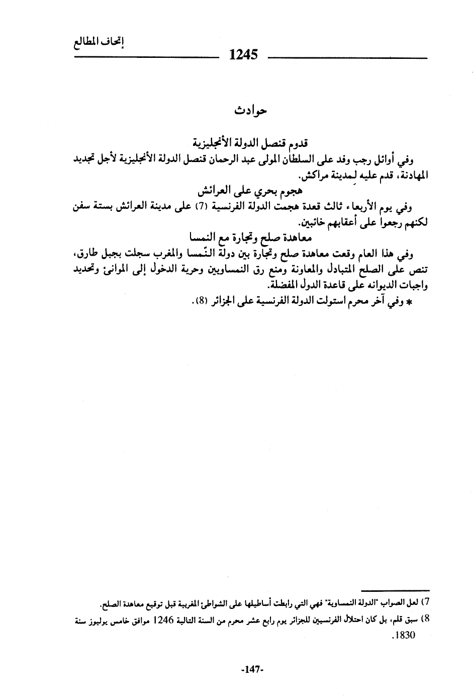 (¬8) سبق قلم، بل كان احتلال الفرنسيين للجزائر يوم رابع عشر محرم من السنة التالية 1246 موافق خامس يوليوز سنة 1830.