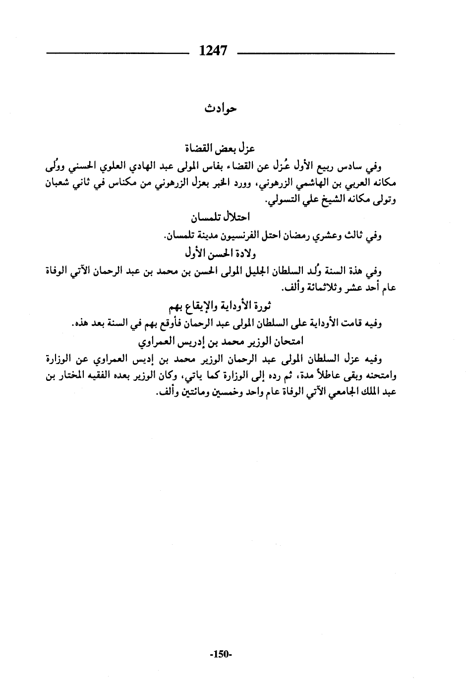 وفي هذه السنة ولد السلطان الجليل المولى الحسن بن محمد بن عبد الرحمان الآتي الوفاة عام أحد عشر وثلاثمائة وألف.