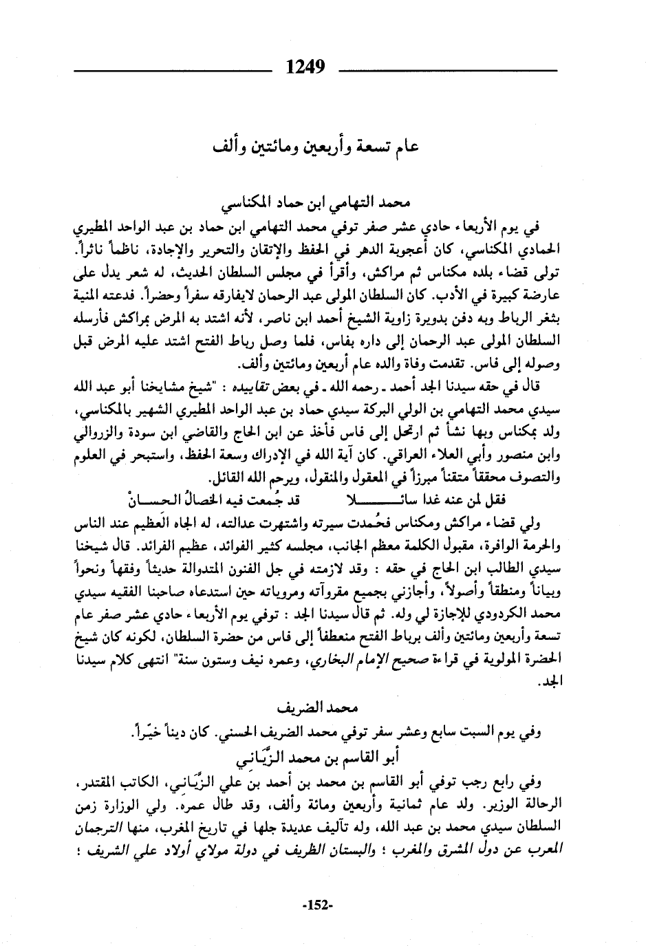 في يوم الأربعاء حادي عشر صفر توفي محمد التهامي ابن حماد بن عبد الواحد المطيري الحمادي المكناسي، كان أعجوبة الدهر في الحفظ والإتقان والتحرير والإجادة، ناظما ناثرا.