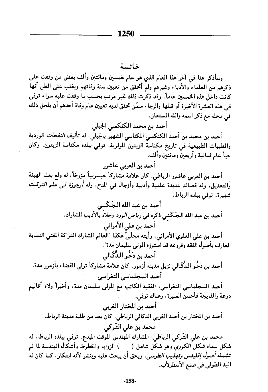وسأذكر هنا في آخر هذا العام الذي هو عام خمسين ومائتين وألف بعض من وقفت على ذكرهم من العلماء والأدباء وغير هم ولم أتحقق من تعيين سنة وفاتهم ويغلب على الظن أنها كانت داخل هذه الخمسين عاما. وقد ذكرت ذلك غير مرتب بحسب ما وقفت عليه سواء توفي في هذه العشرة الأخيرة أو قبلها والرجاء ممّن تحقق لديه تعيين عام وفاة أحدهم أن يلحق ذلك في محله مع ذكر اسمه والله المستعان.