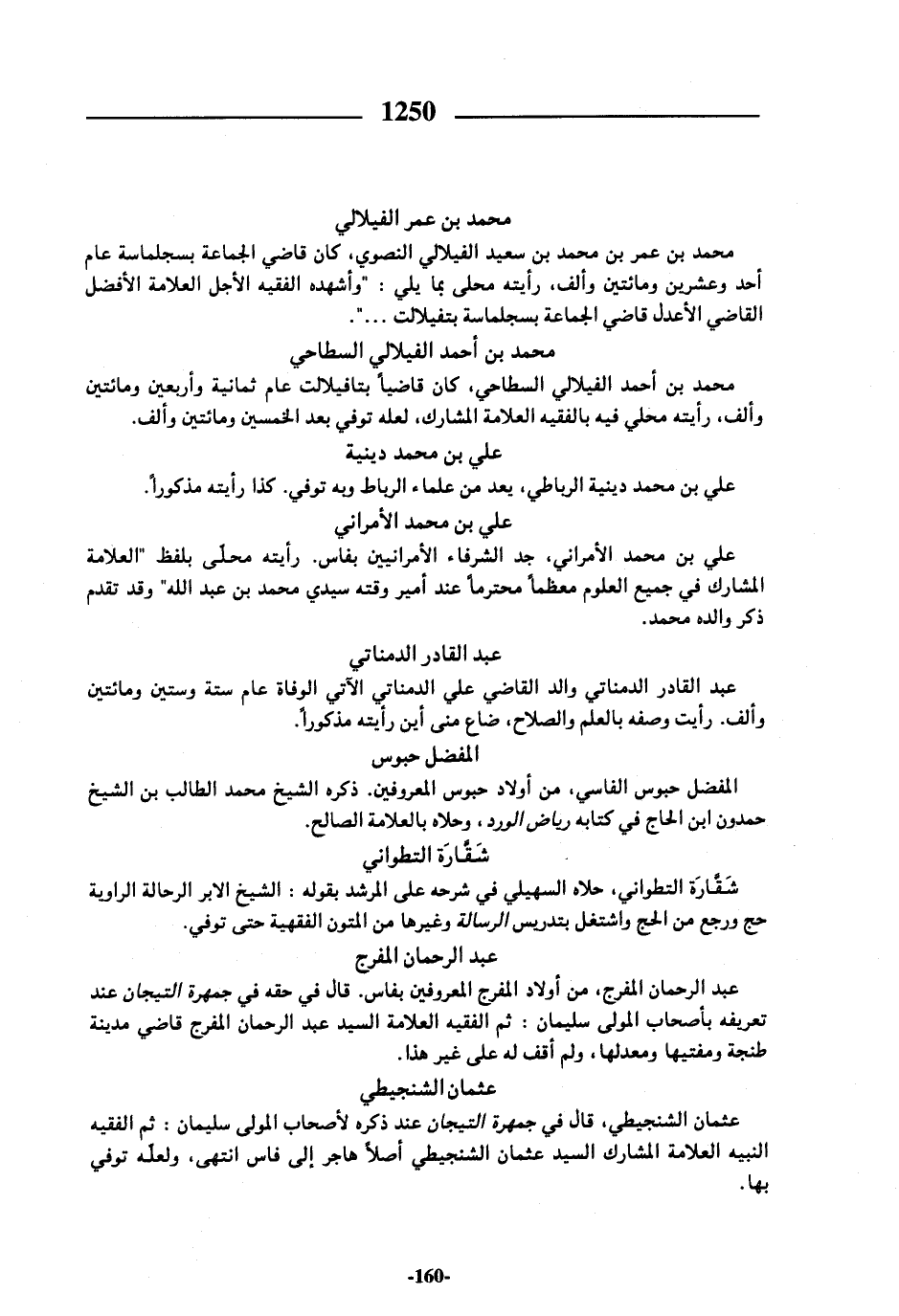 عثمان الشنجيطي، قال في جمهرة التيجان عند ذكره لأصحاب المولى سليمان: ثم الفقيه النبيه العلامة المشارك السيد عثمان الشنجيطي أصلا هاجر إلى فاس انتهى، ولعلّه توفي بها.