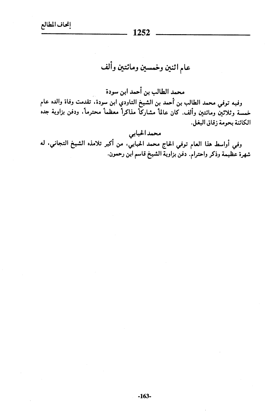 وفيه توفي محمد الطالب بن أحمد بن الشيخ التاودي ابن سودة، تقدمت وفاة والده عام خمسة وثلاثين ومائتين وألف. كان عالما مشاركا مذاكرا معظما محترما، ودفن بزاوية جده الكائنة بحومة زقاق البغل.