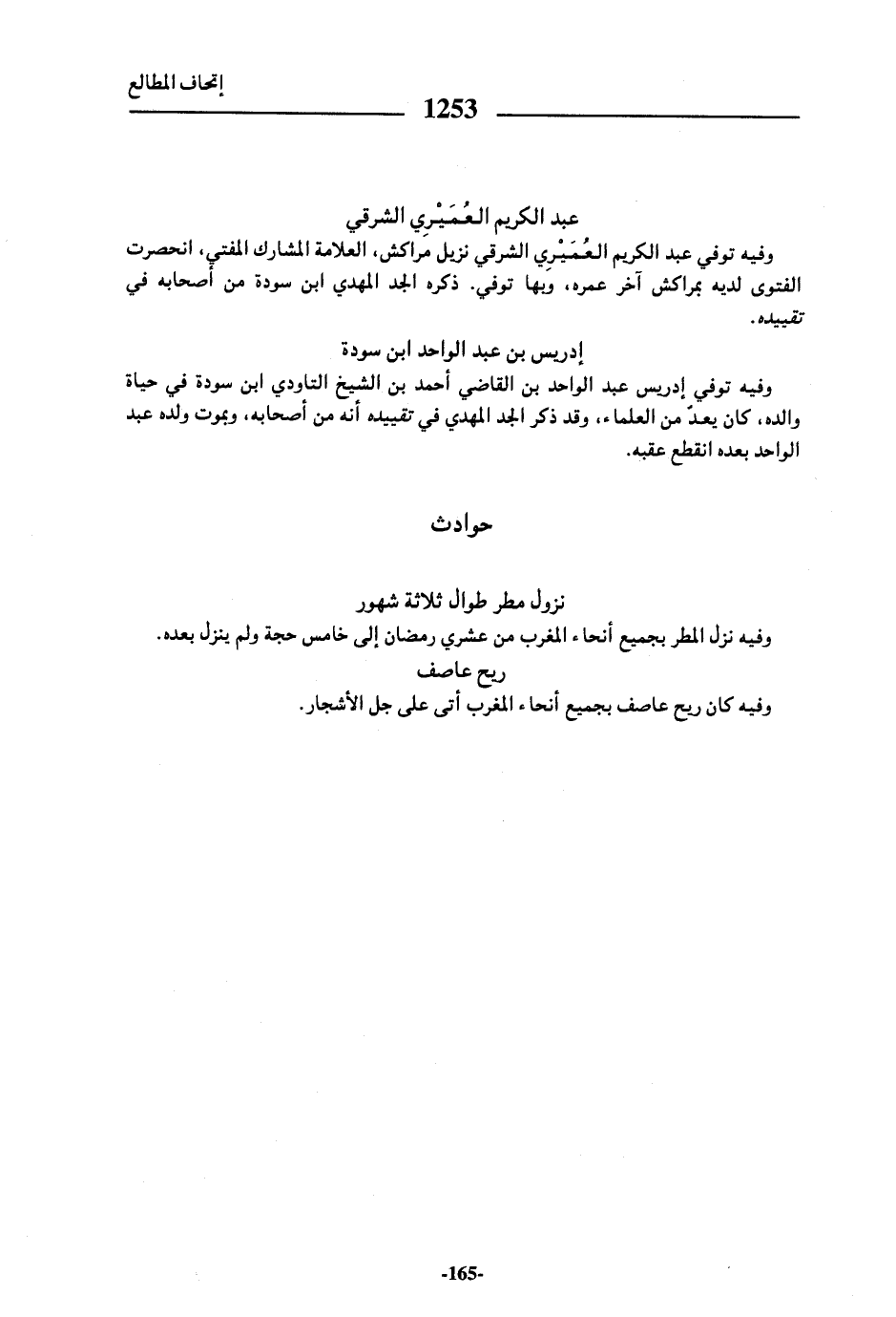 وفيه نزل المطر بجميع أنحاء المغرب من عشري رمضان إلى خامس حجة ولم ينزل بعده.