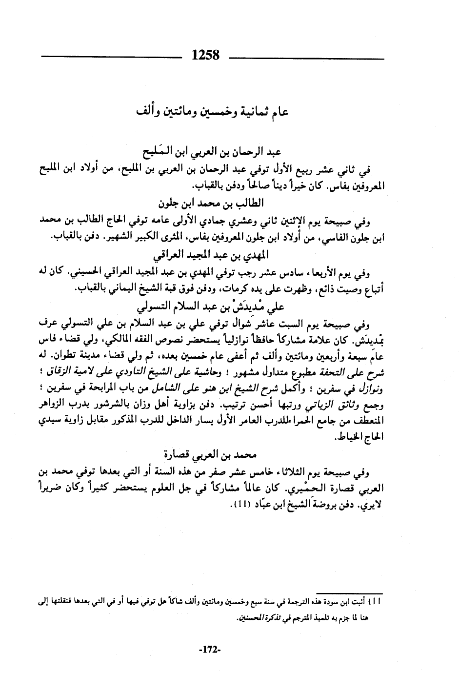 (¬11) أئبت ابن سودة هذه الترجمة في سنة سبع وخمسين ومائتين وألف شاكا هل توفي فيها أو في التي بعدها فنقلتها إلى هنا لما جزم به تلميذ المترجم في تذكرة المحسنين.