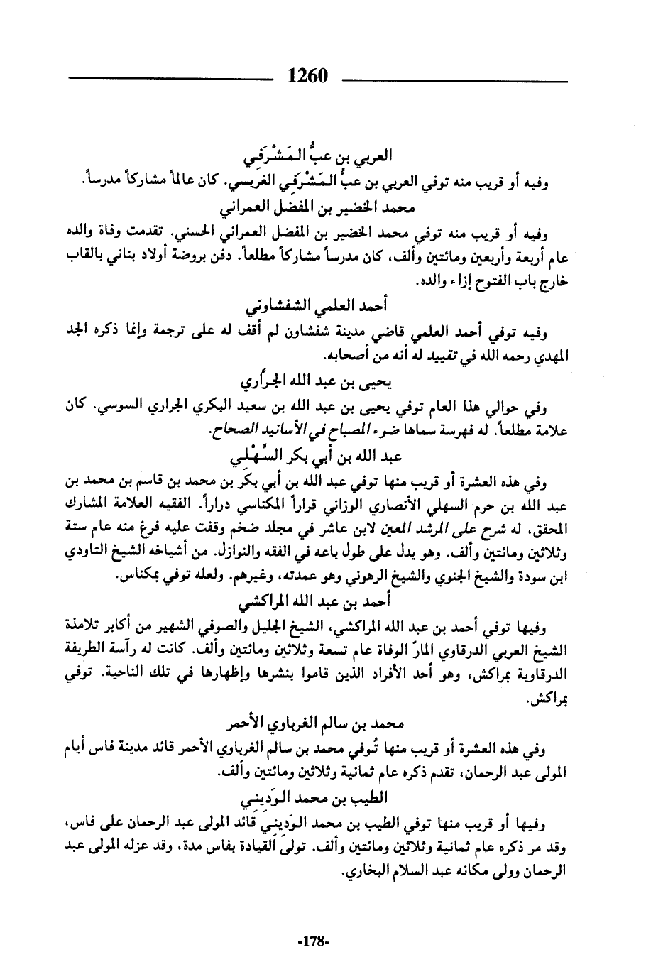 وفي هذه العشرة أو قريب منها توفي عبد الله بن أبي بكر بن محمد بن قاسم بن محمد بن عبد الله بن حرم السهلي الأنصاري الوزاني قرارا المكناسي دارا. الفقيه العلامة المشارك المحقق، له شرح على المرشد المعين لابن عاشر في مجلد ضخم وقفت عليه فرغ منه عام ستة وثلاثين ومائتين وألف. وهو يدل على طول باعه في الفقه والنوازل. من أشياخه الشيخ التاودي ابن سودة والشيخ الجنوي والشيخ الرهوني وهو عمدته، وغير هم. ولعله توفي بمكناس.