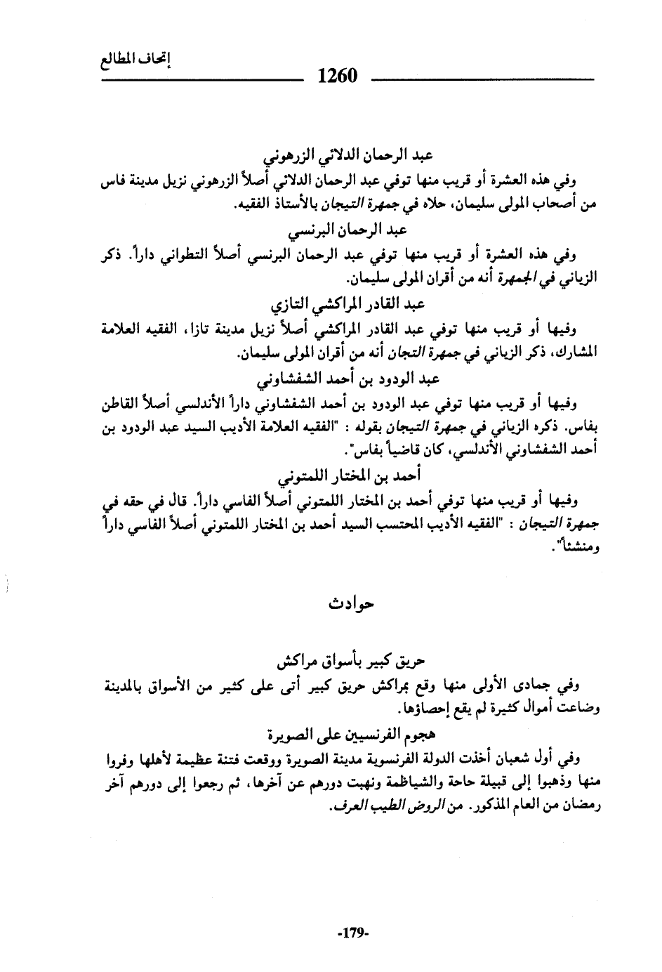 وفي هذه العشرة أو قريب منها توفي عبد الرحمان الدلائي أصلا الزرهوني نزيل مدينة فاس من أصحاب المولى سليمان، حلاه في جمهرة التيجان بالأستاذ الفقيه.