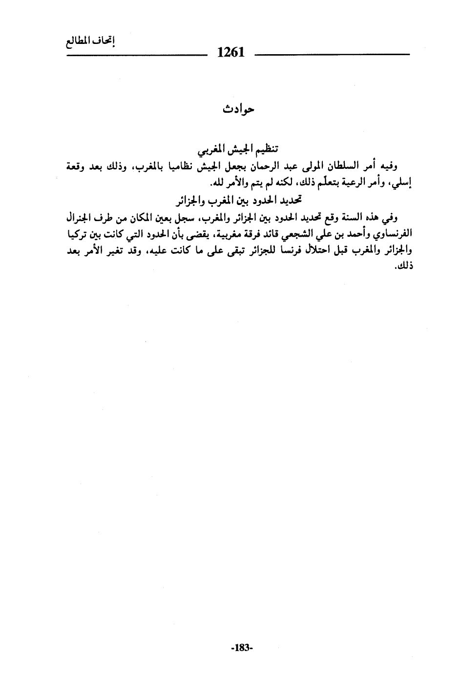 وفيه أمر السلطان المولى عبد الرحمان بجعل الجيش نظاميا بالمغرب، وذلك بعد وقعة إسلي، وأمر الرعية بتعلّم ذلك، لكنه لم يتم والأمر لله.