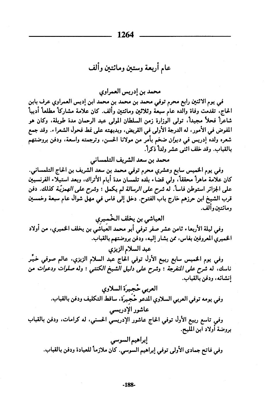 في يوم الاثنين رابع محرم توفي محمد بن محمد بن محمد ابن إدريس العمراوي عرف بابن الحاج، تقدمت وفاة والده عام سبعة وثلاثين ومائتين وألف. كان علامة مشاركا مطلعا أديبا شاعرا فحلا مجيدا، تولى الوزارة زمن السلطان المولى عبد الرحمان مدة طويلة، وكان هو المفوض في الأمور، له الدرجة الأولى في القريض، وبديهته على نمط فحول الشعراء. وقد جمع شعره ولده إدريس في ديوان ضخم بأمر من مولانا الحسن، وترجمته واسعة، ودفن بروضتهم بالقباب. وقد خلف اثنى عشر ولدا ذكرا.