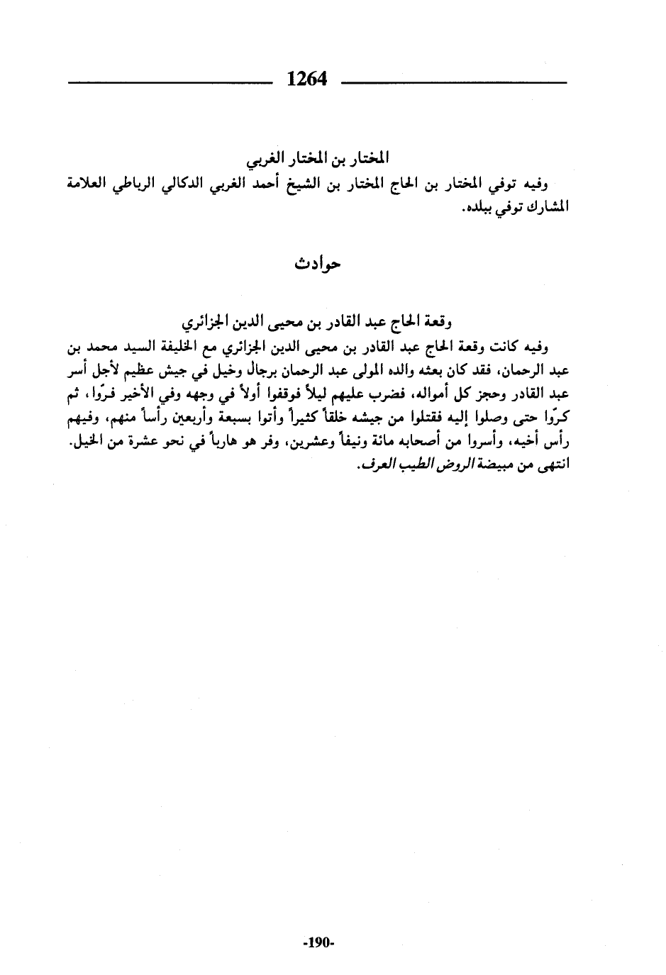 وفيه كانت وقعة الحاج عبد القادر بن محيى الدين الجزائري مع الخليفة السيد محمد بن عبد الرحمان، فقد كان بعثه والده المولى عبد الرحمان برجال وخيل في جيش عظيم لأجل أسر عبد القادر وحجز كل أمواله، فضرب عليهم ليلا فوقفوا أولا في وجهه وفي الأخير فرّوا، ثم كرّوا حتى وصلوا إليه فقتلوا من جيشه خلقا كثيرا وأتوا بسبعة وأربعين رأسا منهم، وفيهم رأس أخيه، وأسروا من أصحابه مائة ونيفا وعشرين، وفر هو هاربا في نحو عشرة من الخيل.