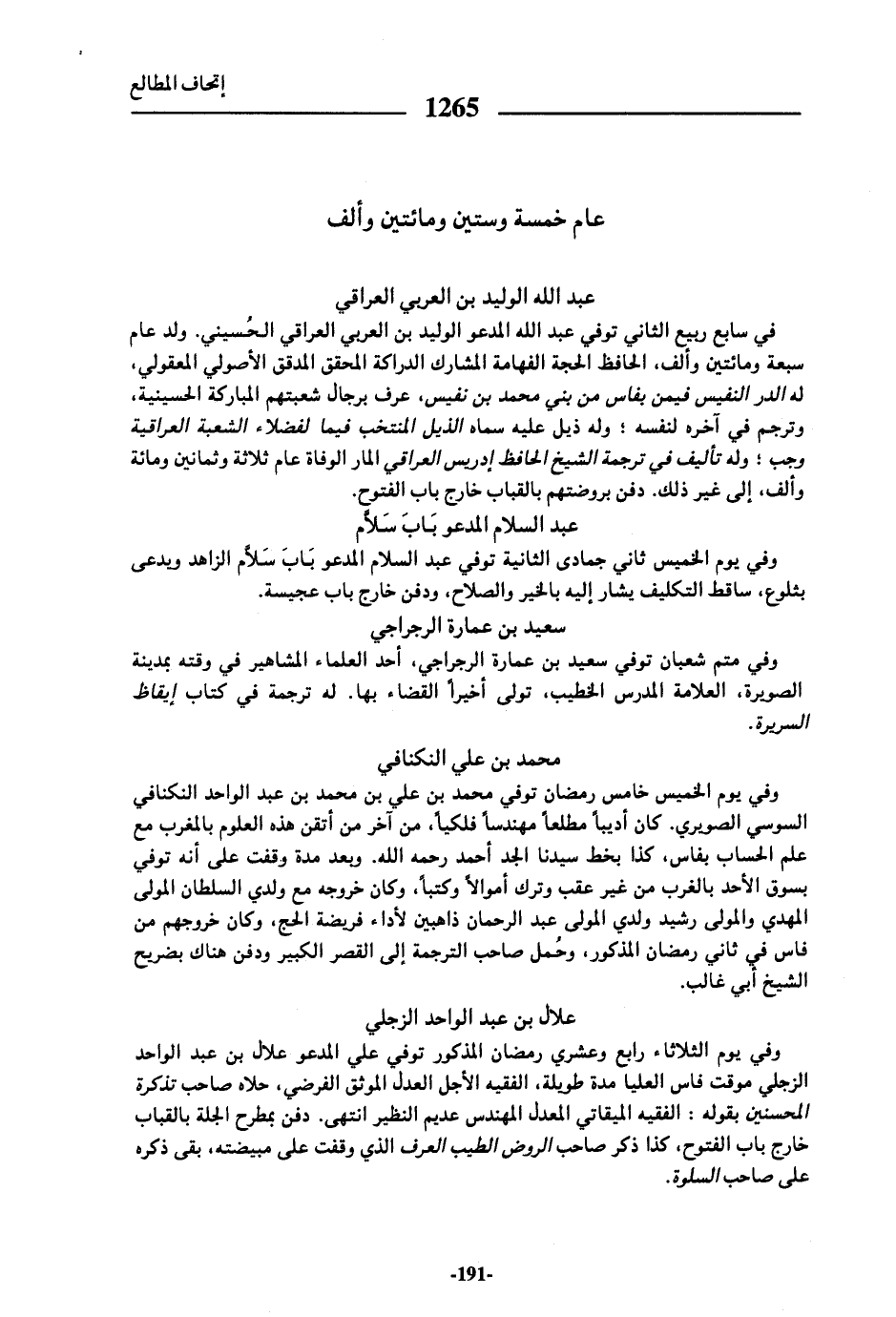 في سابع ربيع الثاني توفي عبد الله المدعو الوليد بن العربي العراقي الحسيني. ولد عام سبعة ومائتين وألف، الحافظ الحجة الفهامة المشارك الدراكة المحقق المدقق الأصولي المعقولي، له الدر النفيس فيمن بفاس من بني محمد بن نفيس، عرف برجال شعبتهم المباركة الحسينية، وترجم في آخره لنفسه؛ وله ذيل عليه سماه الذيل المنتخب فيما لفضلاء الشعبة العراقية وجب؛ وله تأليف في ترجمة الشيخ الحافظ إدريس العراقي المار الوفاة عام ثلاثة وثمانين ومائة وألف، إلى غير ذلك. دفن بروضتهم بالقباب خارج باب الفتوح.