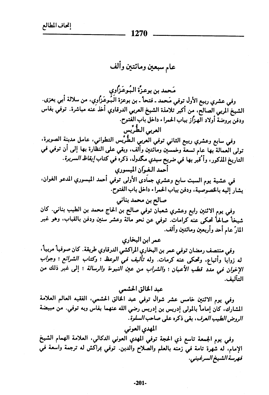 وفي منتصف رمضان توفي عمر بن البخاري المراكشي الدرقاوي طريقة. كان صوفيا مربيا، له زوايا وأتباع، وتحكى عنه كرمات. وله تأليف في الوعظ؛ وكتاب الشرائع؛ وجواب الإخوان في مدد قطب الأعيان؛ والشراب من عين النبوءة والرسالة؛ إلى غير ذلك من التآليف.