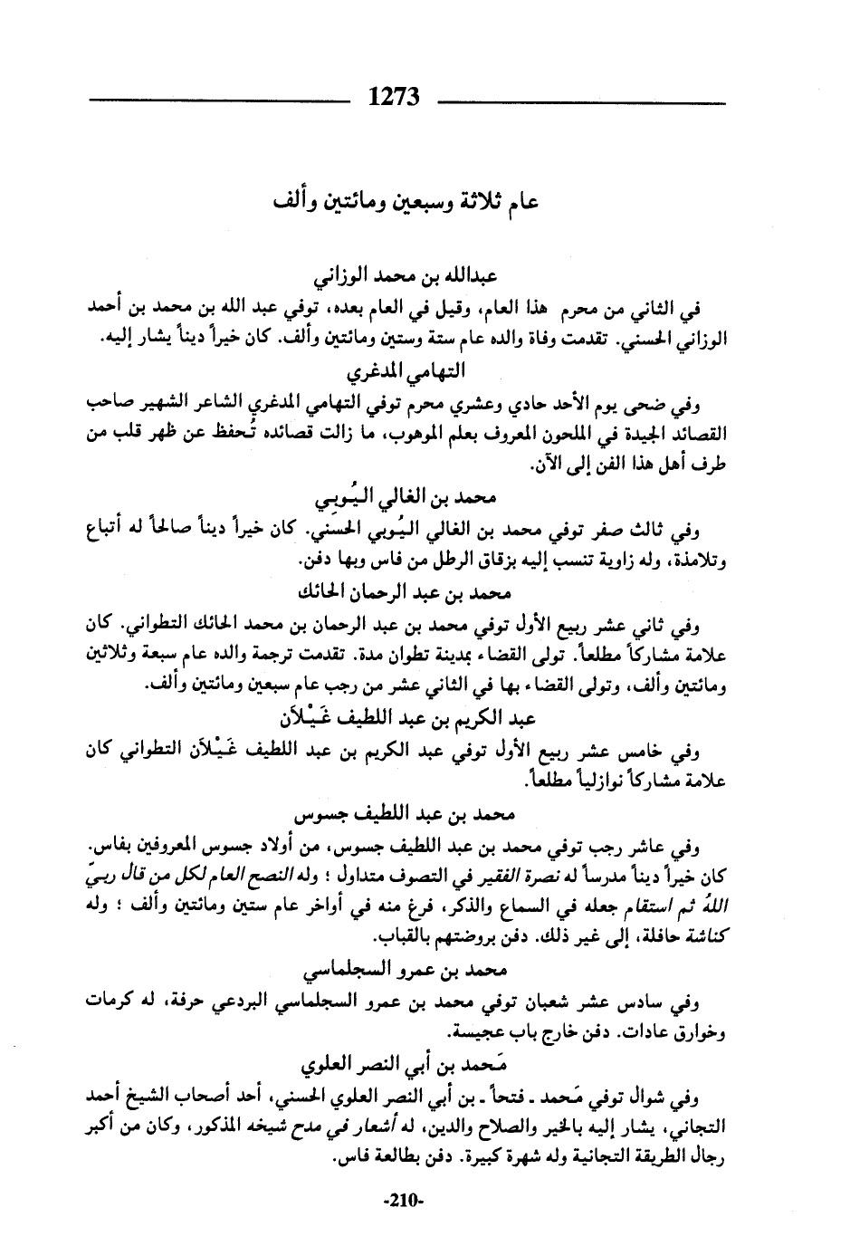 وفي ضحى يوم الأحد حادي وعشري محرم توفي التهامي المدغري الشاعر الشهير صاحب القصائد الجيدة في الملحون المعروف بعلم الموهوب، ما زالت قصائده تحفظ عن ظهر قلب من طرف أهل هذا الفن إلى الآن.