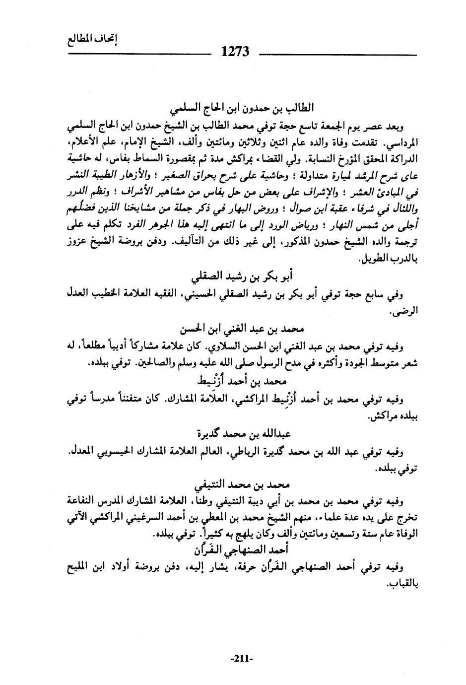 وبعد عصر يوم الجمعة تاسع حجة توفي محمد الطالب بن الشيخ حمدون ابن الحاج السلمي المرداسي. تقدمت وفاة والده عام اثنين وثلاثين ومائتين وألف، الشيخ الإمام، علم الأعلام، الداركة المحقق المؤرخ النسابة. ولي القضاء بمراكش مدة ثم بمقصورة السماط بفاس، له حاشية على شرح المرشد لميارة متداولة؛ وحاشية على شرح بحراق الصغير؛ والأزهار الطيبة النشر في المبادئ العشر؛ والإشراف على بعض من حل بفاس من مشاهير الأشراف؛ ونظم الدرر واللئال في شرفاء عقبة ابن صوال؛ وروض البهار في ذكر جملة من مشايخنا الذين فضلهم أجلى من شمس النهار؛ ورياض الورد إلى ما انتهى إليه هذا الجوهر الفرد تكلم فيه على ترجمة والده الشيخ حمدون المذكور، إلى غير ذلك من التآليف. ودفن بروضة الشيخ عزوز بالدرب الطويل.