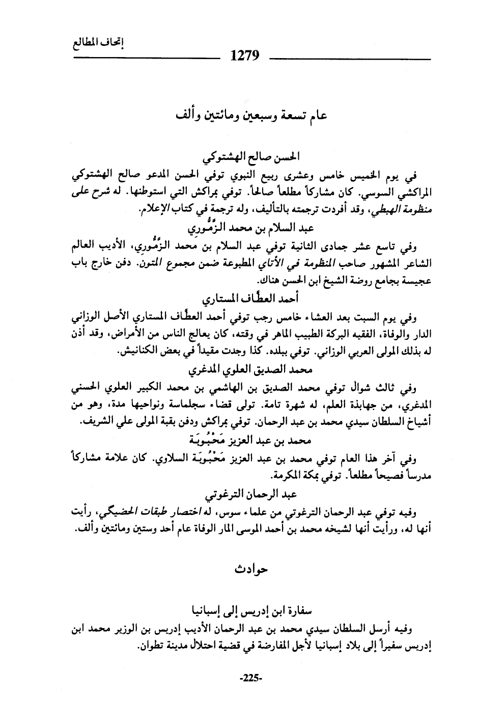 وفيه توفي عبد الرحمان الترغوتي من علماء سوس، له اختصار طبقات الحضيكي، رأيت أنها له، ورأيت أنها لشيخه محمد بن أحمد الموسى المار الوفاة عام أحد وستين ومائتين وألف.