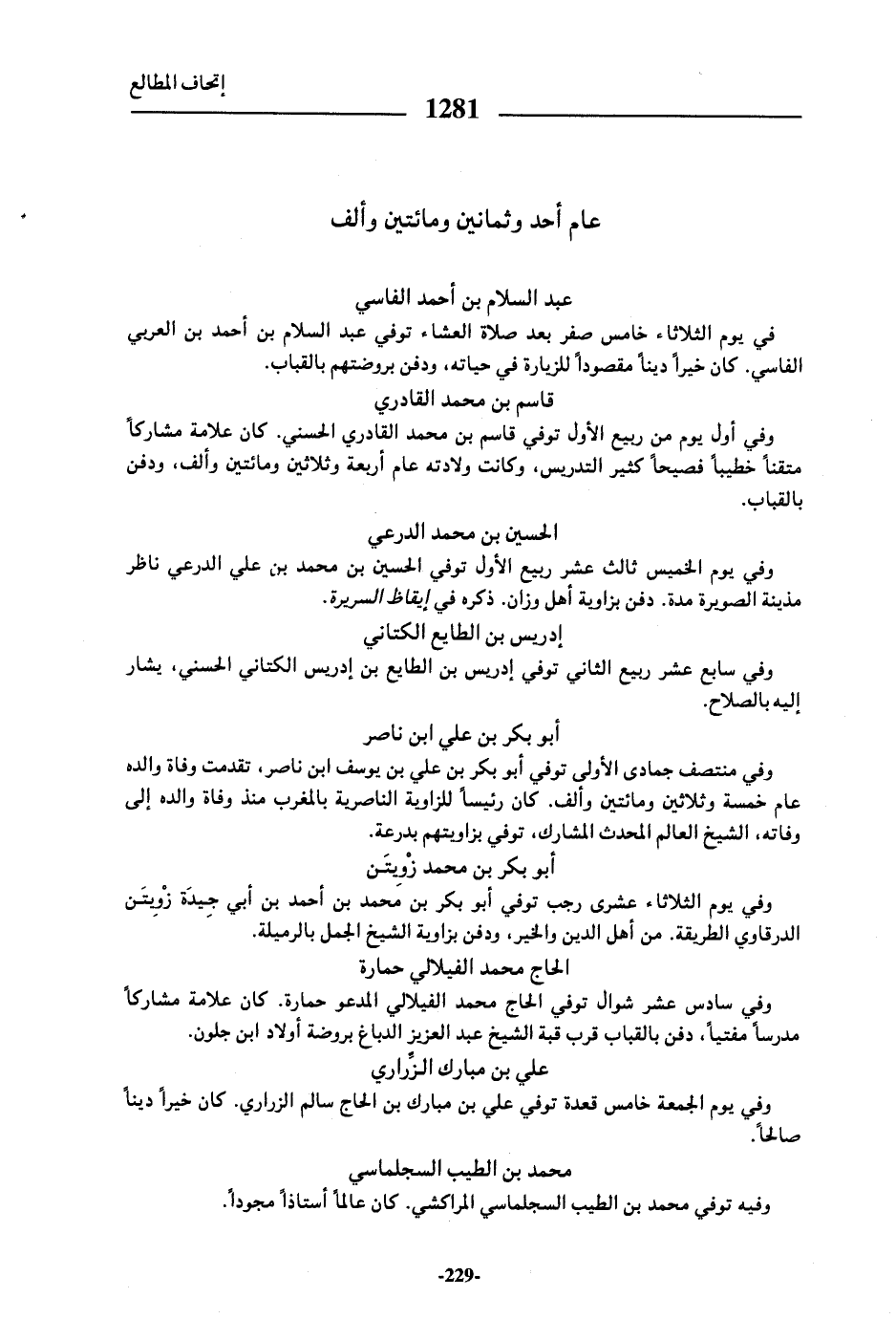 وفي سادس عشر شوال توفي الحاج محمد الفيلالي المدعو حمارة. كان علامة مشاركا مدرسا مفتيا، دفن بالقباب قرب قبة الشيخ عبد العزيز الدباغ بروضة أولاد ابن جلون.