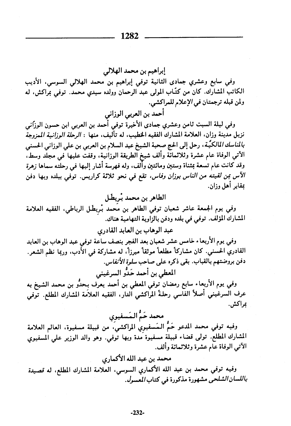 وفي سابع وعشري جمادى الثانية توفي إبراهيم بن محمد الهلالي السوسي، الأديب الكاتب المشارك. كان من كتّاب المولى عبد الرحمان وولده سيدي محمد. توفي بمراكش، له ولمن قبله ترجمتان في الإعلام للمراكشي.