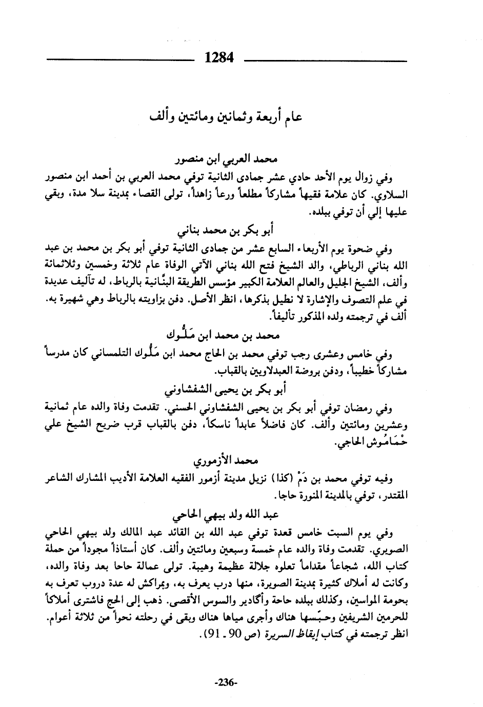 وفي رمضان توفي أبو بكر بن يحيى الشفشاوني الحسني. تقدمت وفاة والده عام ثمانية وعشرين ومائتين وألف. كان فاضلا عابدا ناسكا، دفن بالقباب قرب ضريح الشيخ علي حماموش الحاجي.