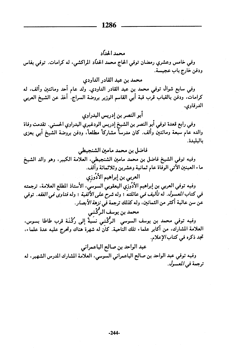 وفيه توفي العربي بن إبراهيم الأدوزي اليعقوبي السوسي، الأستاذ المطلع العلامة، ترجمته في كتاب المعسول. له تأليف في عائلته؛ وله شرح على الألفية؛ وله فتاوى في الفقه. توفي عن سن عالية أكثر من الثمانين، وله كذلك ترجمة في نزهة الأبصار.